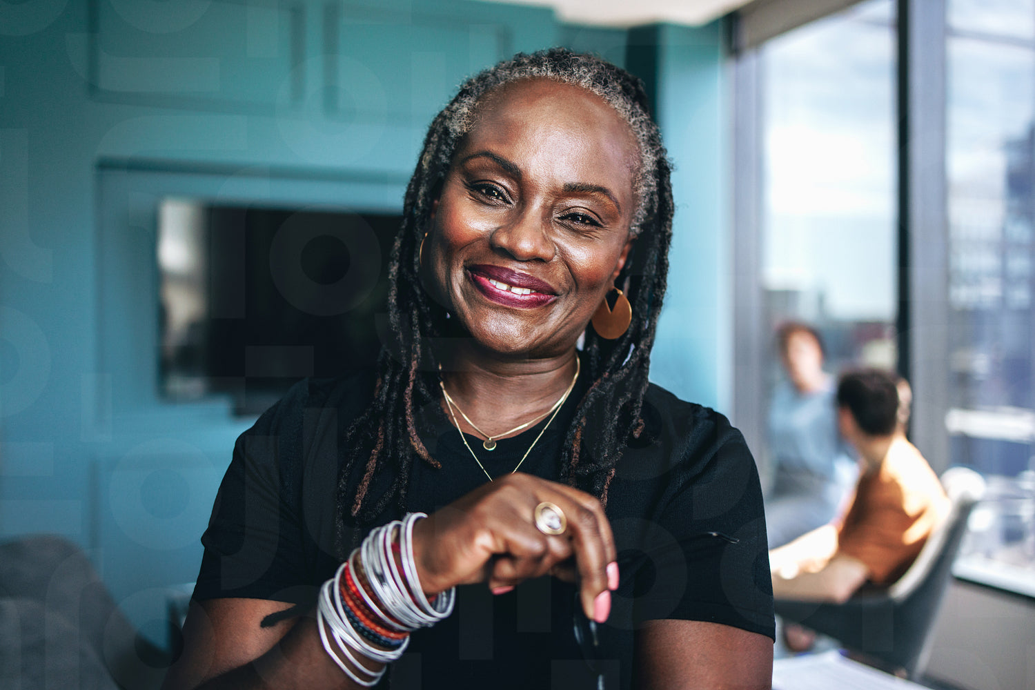 Woman with dreadlocks smiling at the camera during a meeting in a business office. Mature and professional business woman leading a corporate team towards success.