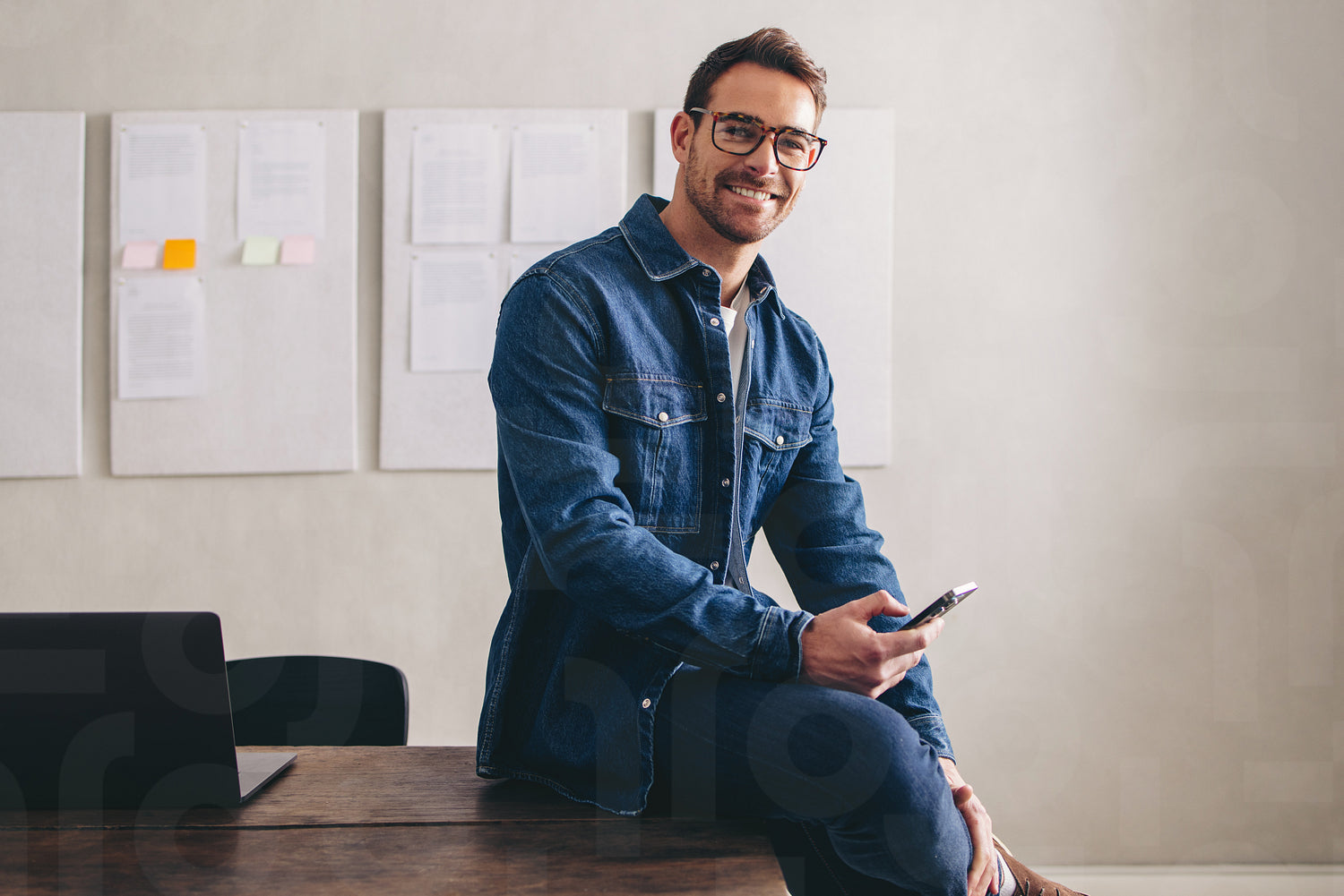 Happy young businessman smiling at the camera while sitting on a desk with a smartphone. Cheerful businessman with eyeglasses working remotely in a creative office.