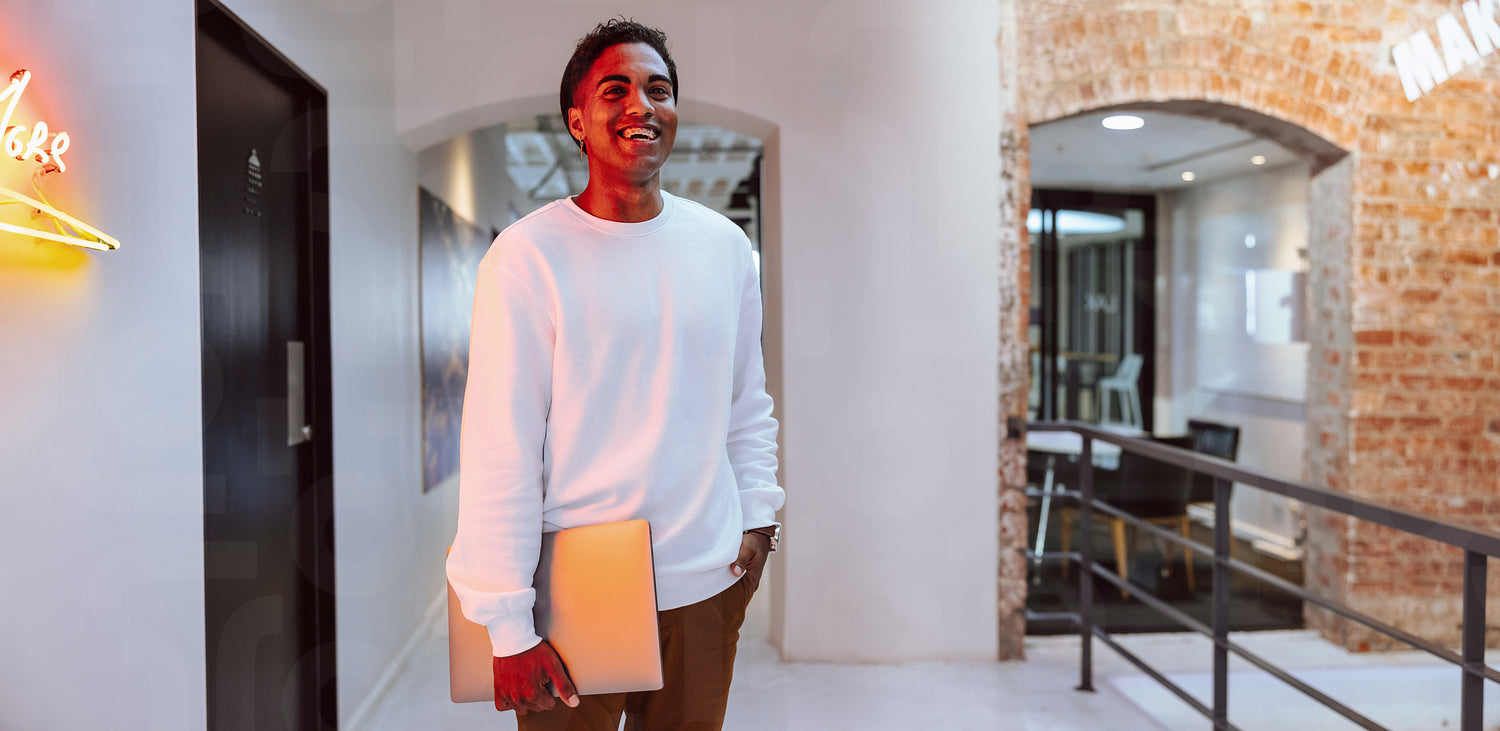 Happy businessman smiling cheerfully while standing alone in a modern workplace. Young businessman holding a laptop in his hand. Creative businessman feeling great about his success.