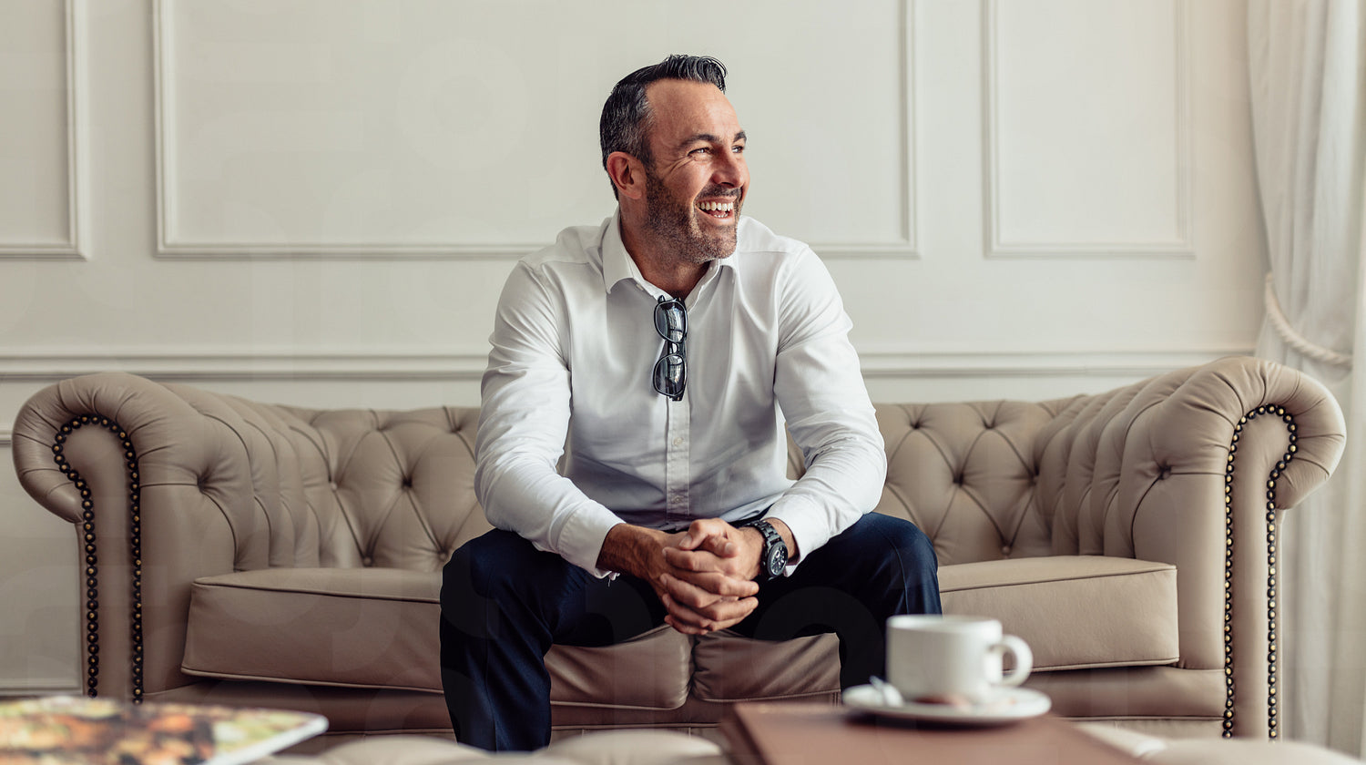 Portrait of cheerful businessman sitting on sofa in hotel room and looking away laughing. CEO staying in luxurious hotel room on business trip.