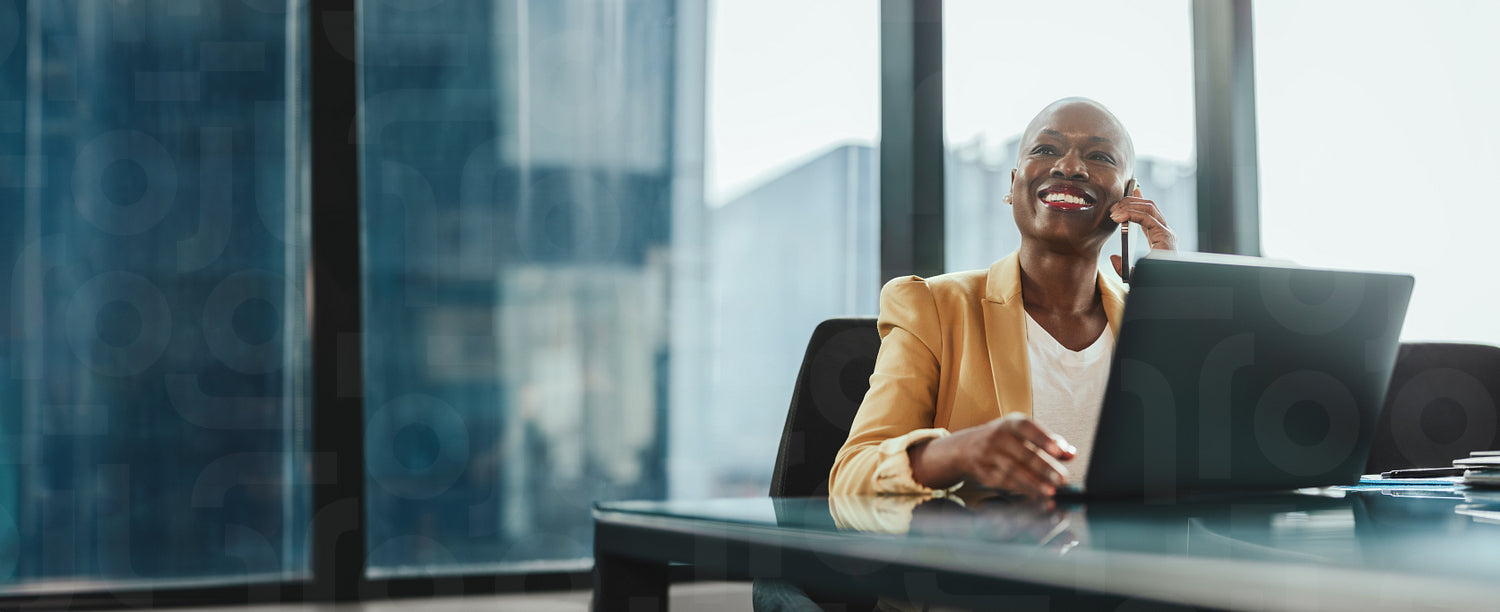 Businesswoman in a modern office, using her laptop and speaking on the phone. She is confident and successful, dressed in corporate attire. Woman communicating with her associates using technology.