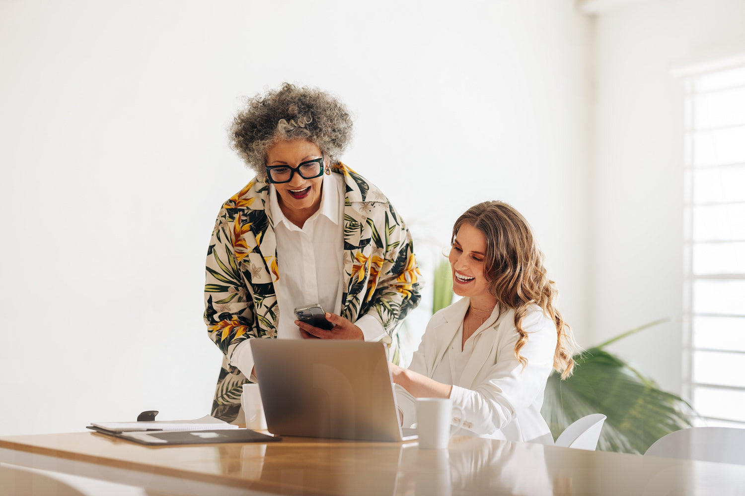 Happy businesswomen smiling cheerfully during a video call with their business colleagues. Two diverse businesswomen having an online meeting in a woman-owned startup.