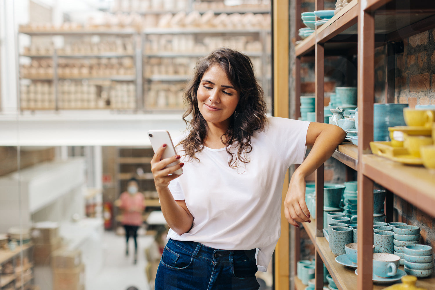Happy ceramic store owner reading a text message on her smartphone. Businesswoman managing a store with a collection of earthenware products. Cheerful young woman running a successful small business.