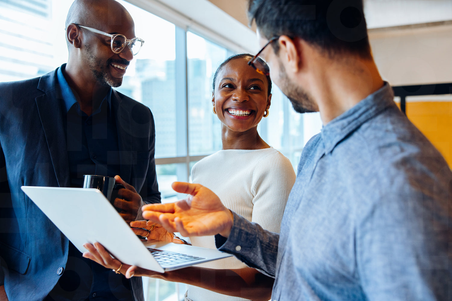 Three coworkers enjoying a lively conversation while looking at a laptop in a city office. They are smiling and engaged, suggesting a positive and creative atmosphere.