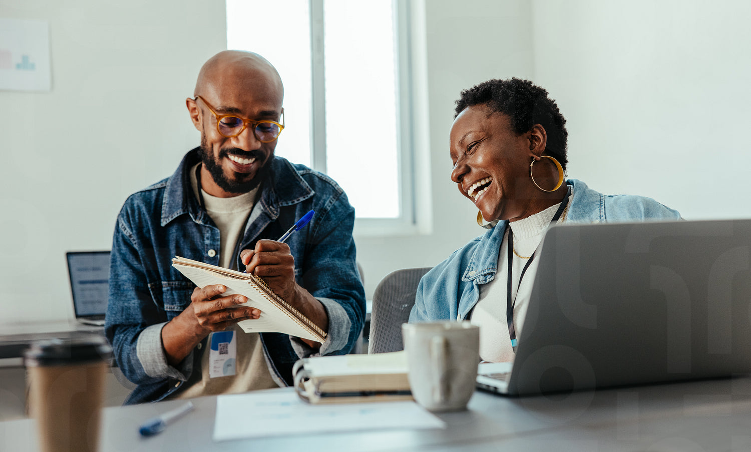Smiling colleagues working together, writing notes, and sharing ideas in a happy and collaborative office environment.