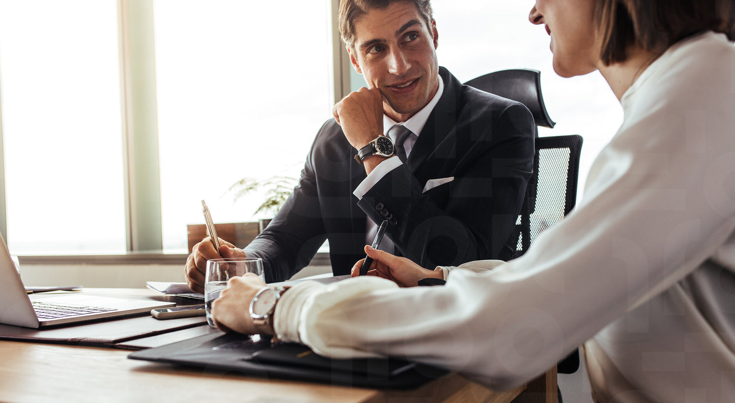 Two happy corporate professionals having a meeting in office. Businessman and businesswoman working and discussing on a new project in office.