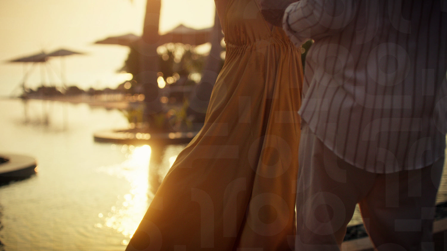 A joyful couple dances together while holding cocktails by the pool at sunset. This romantic vacation moment conveys love, celebration, and relaxation under golden hour light.