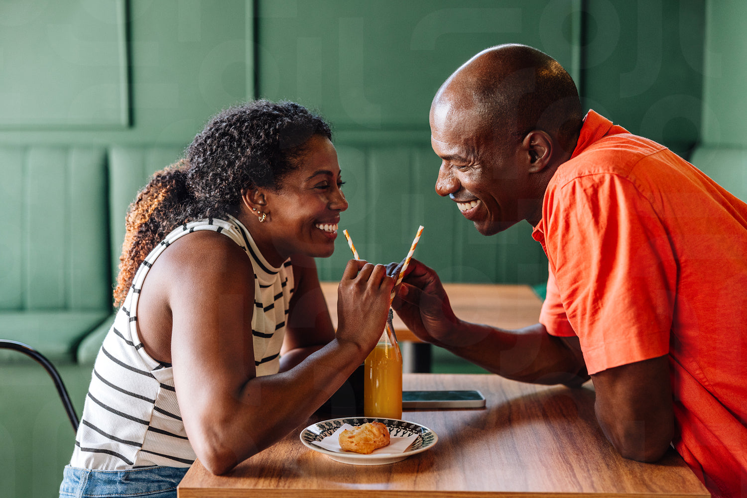 A joyful black couple shares a light moment over breakfast, smiling and laughing together, exuding happiness and fun in a cozy cafe.