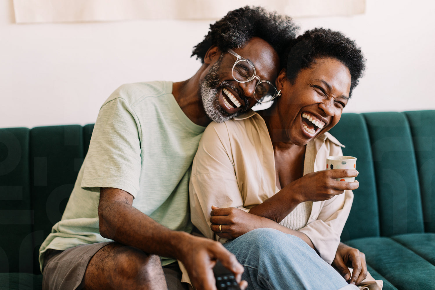 Mature couple sitting on a sofa at home, laughing as they watch a tv show together. Husband and wife enjoying some quality time together, showing genuine happiness and love.