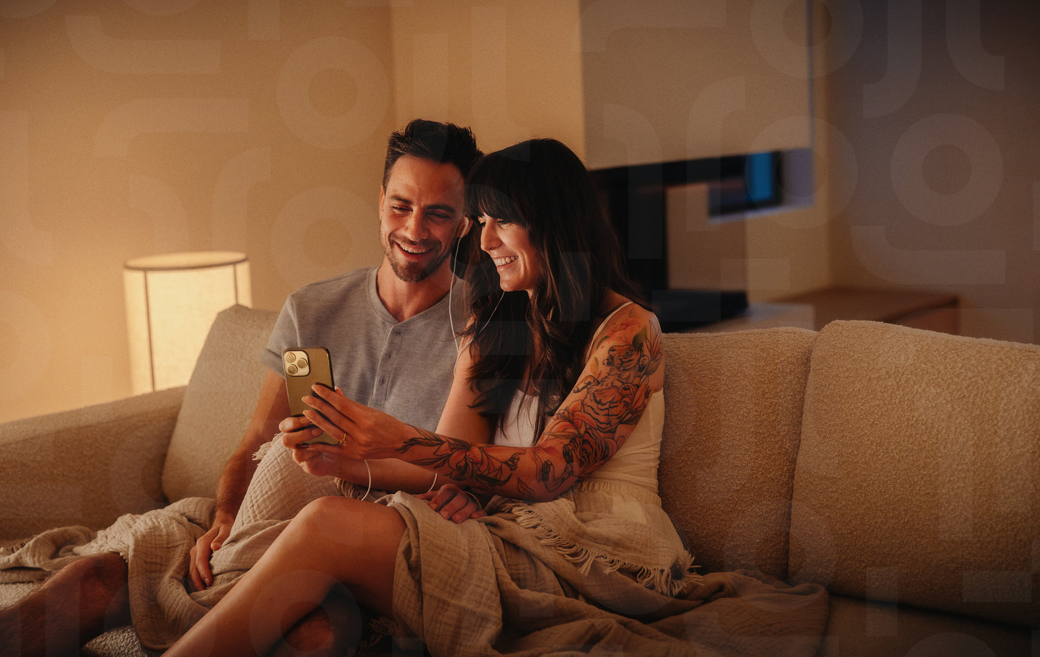 Couple sharing earphones and listening to music on a smartphone. They are relaxed, smiling, and sitting closely together on a couch in their home. This photo features intentional 35mm film grain.