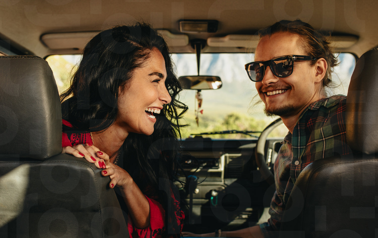 Rear view of a young couple on road trip. Smiling man and woman looking back sitting in a car.
