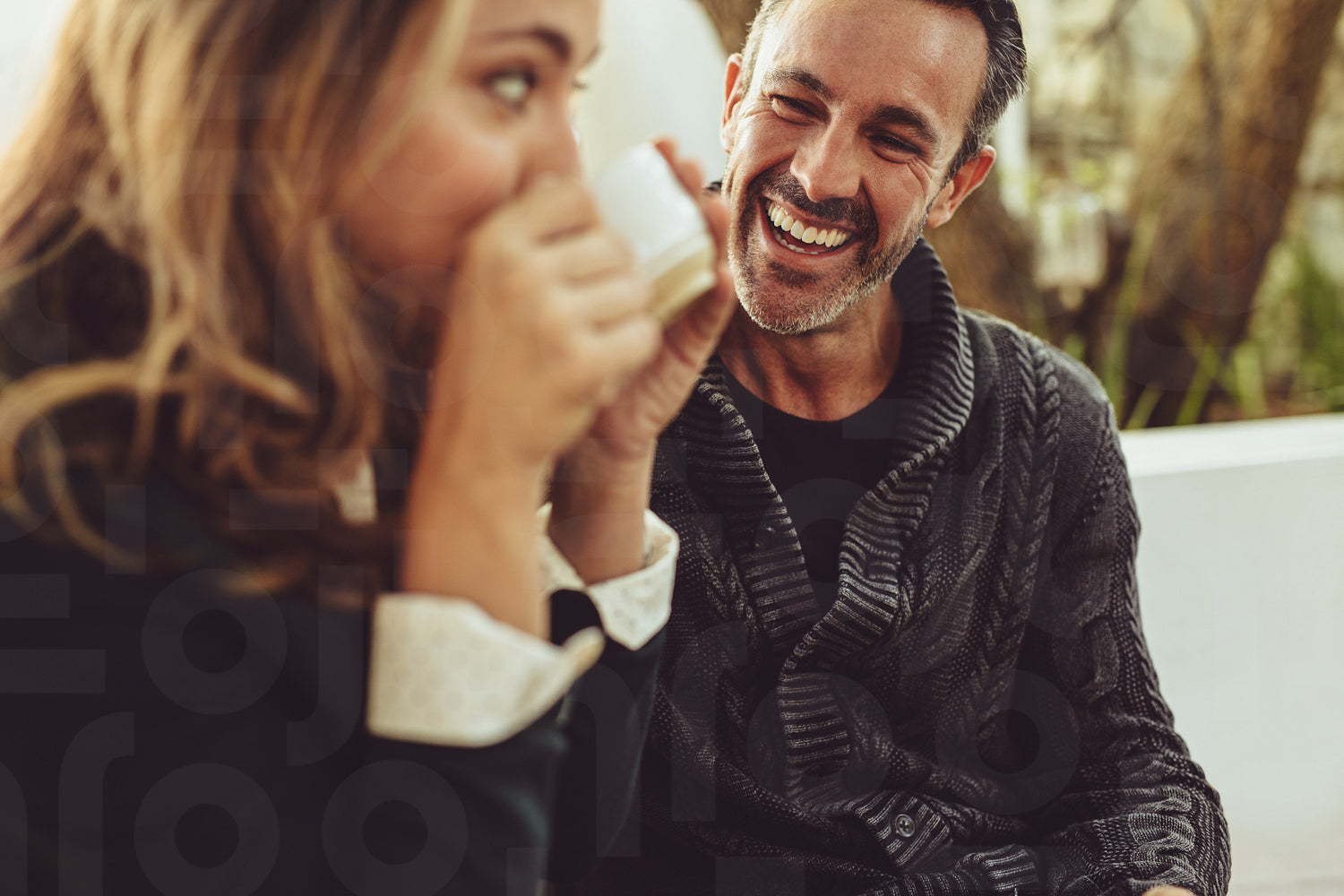 Smiling man looking at his girlfriend drinking coffee. Couple sitting at coffee shop.