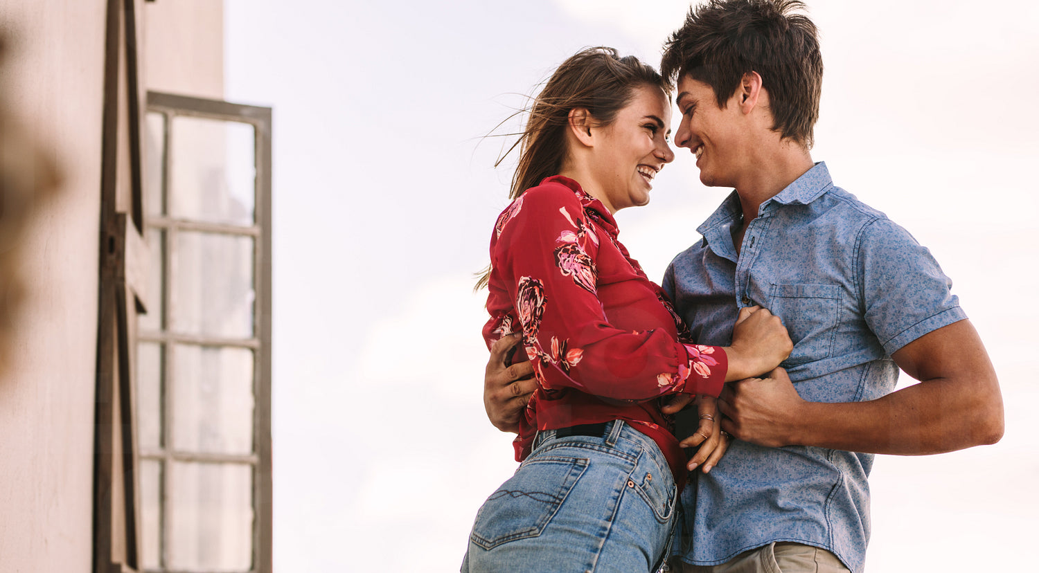Smiling man holding his girlfriend standing close looking at her. Couple in romantic mood standing close embracing and holding each other.