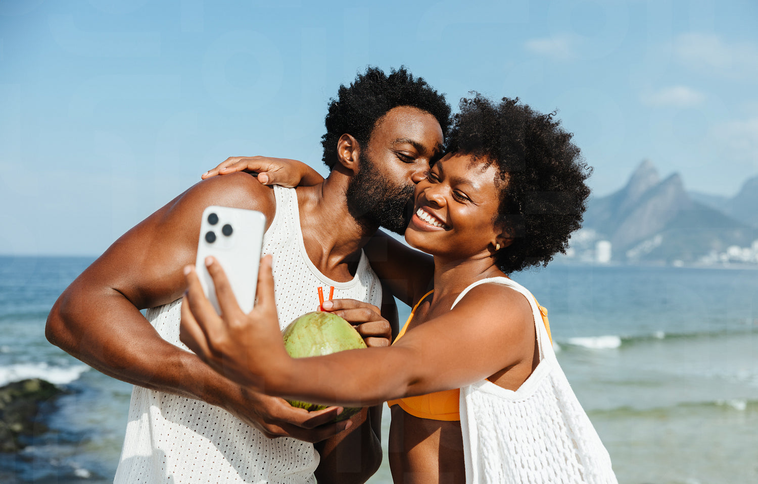 A joyful couple captures a selfie while enjoying their holiday at Ipanema Beach. Their smiles convey happiness and the spirit of a carefree vacation, a perfect depiction of cherished holiday memories.