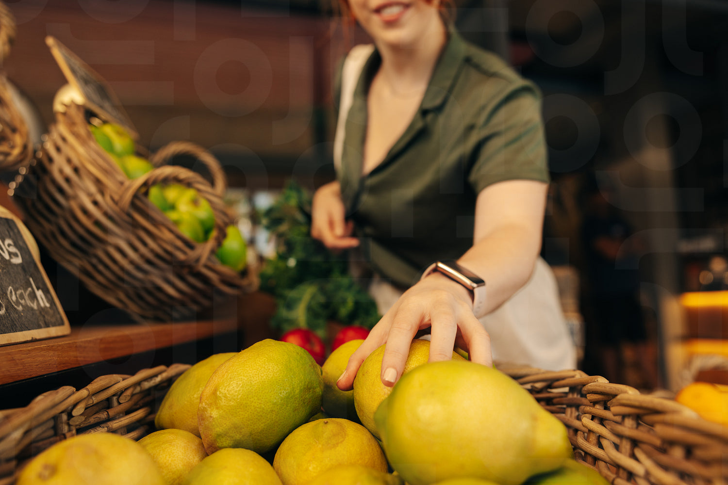 Happy customer picking some organic fruits in the fresh produce section of a grocery store. Unrecognizable woman grocery shopping in a trendy supermarket.