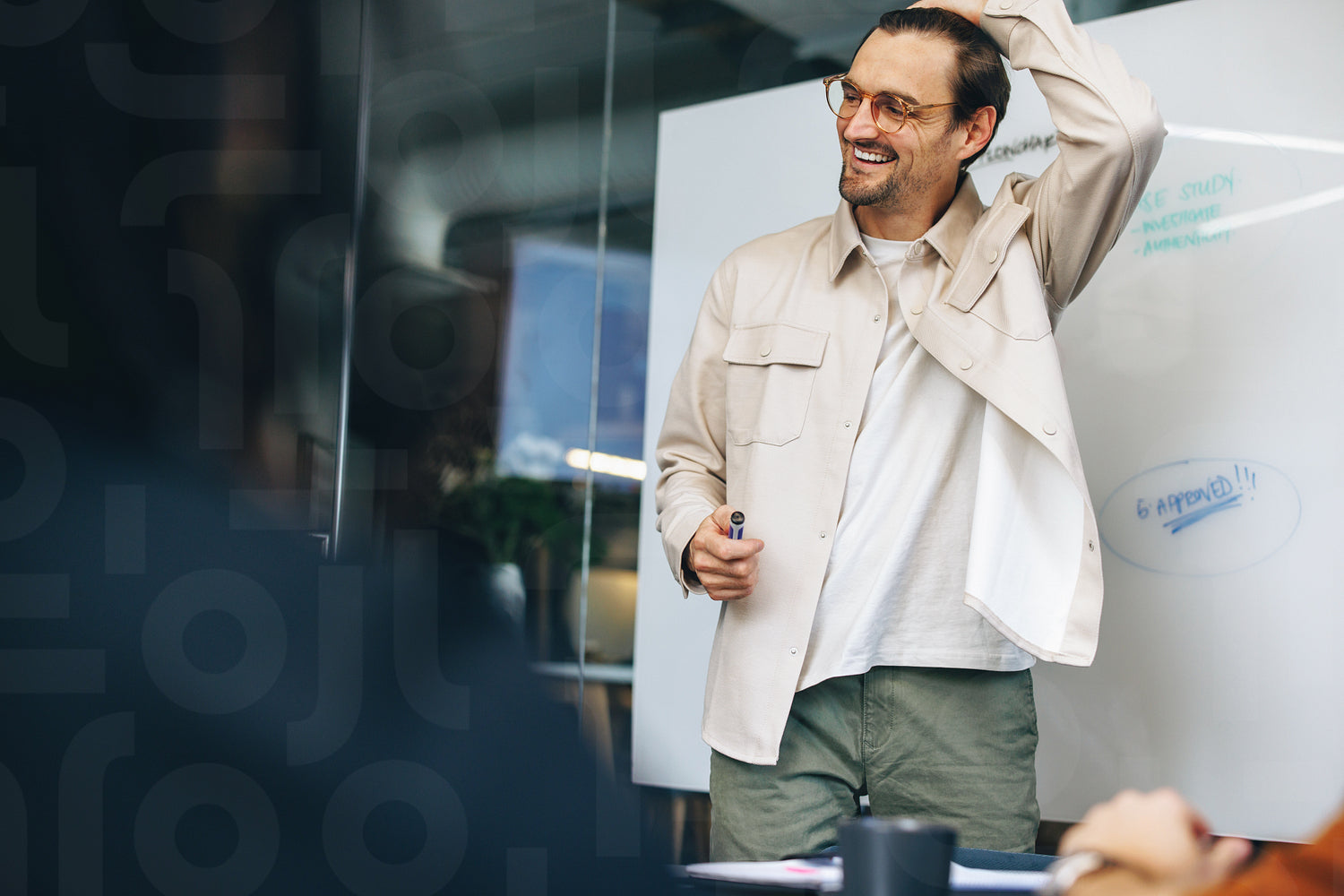 Male entrepreneur stands in front of his colleagues with a smile on his face, discussing a team project with the group. Business man leading a meeting in a modern workplace.