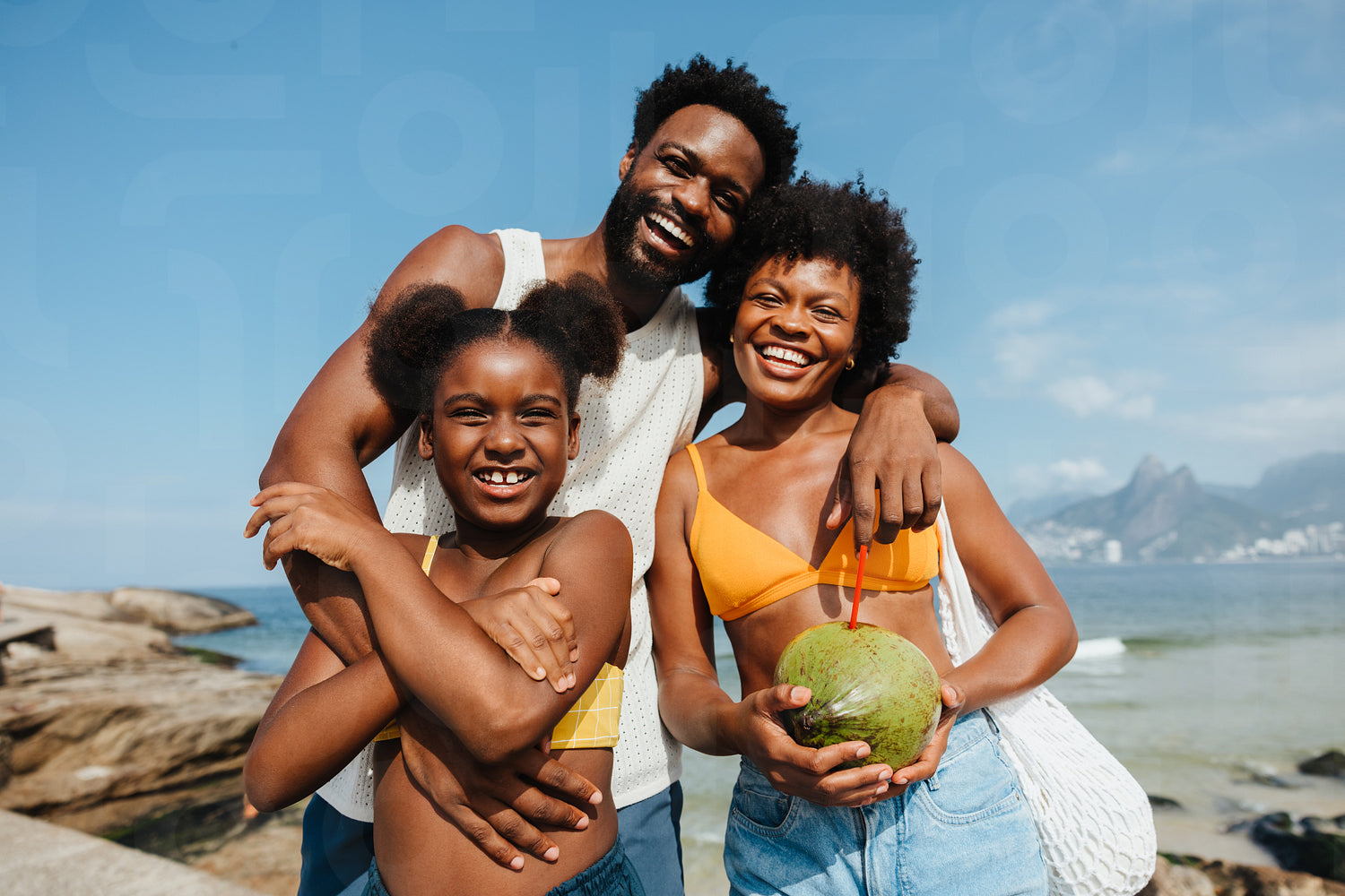 A joyful family poses for a holiday photograph by the beach. In the background, the sea and sky blend perfectly, adding to the serene holiday vibe.