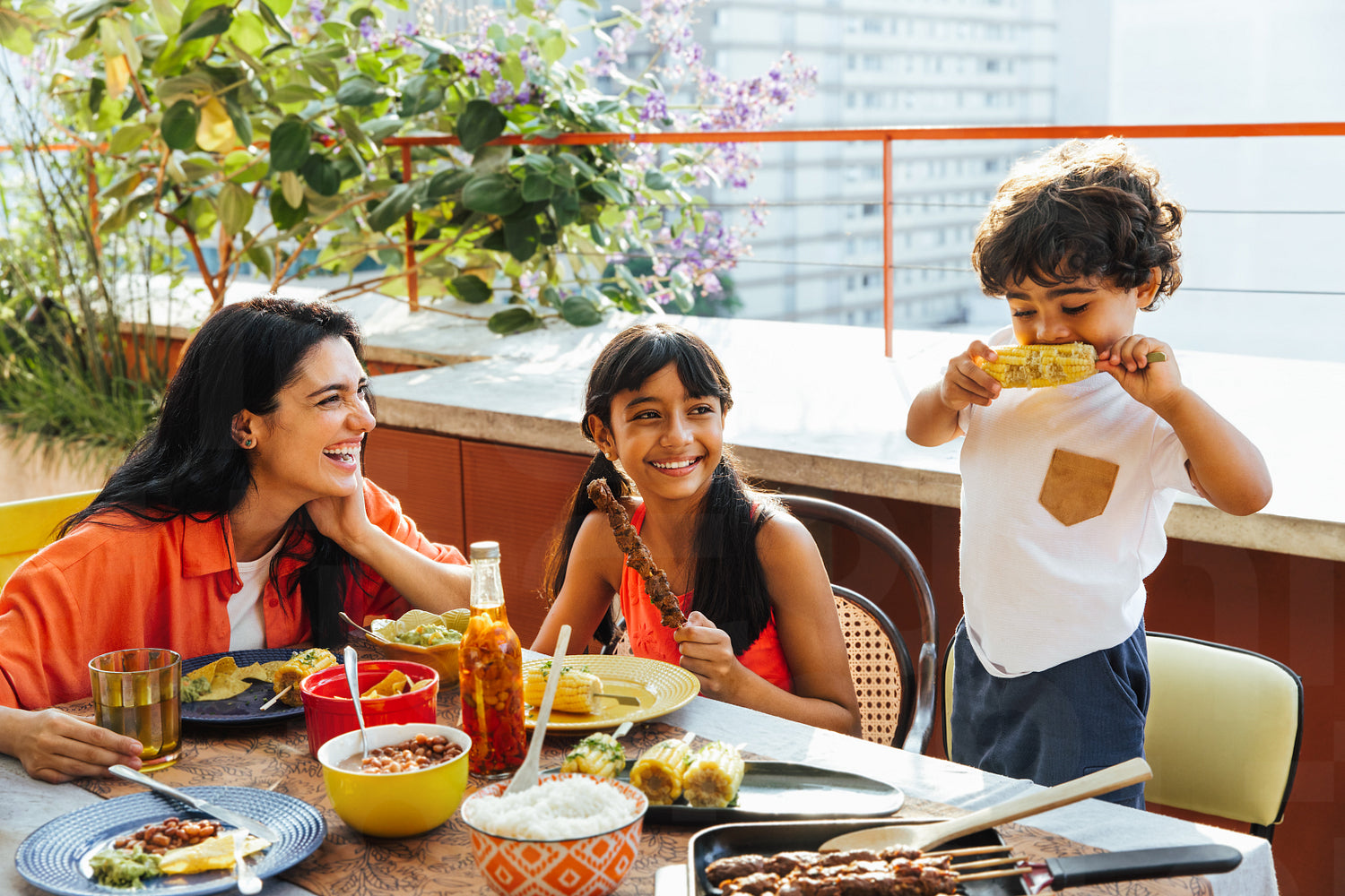 A cheerful family having a delightful meal outdoors, sharing laughter and joyful moments. The setting includes a balcony with greenery, delicious food, and a warm atmosphere enhancing the experience.