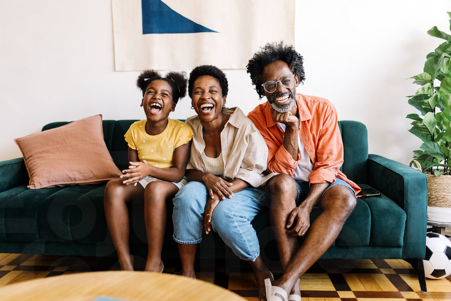 Two parents and their young daughter sit on the couch, smiling and laughing while watching a game on TV. Cheerful black family relaxing at home, having fun and enjoying quality time together.