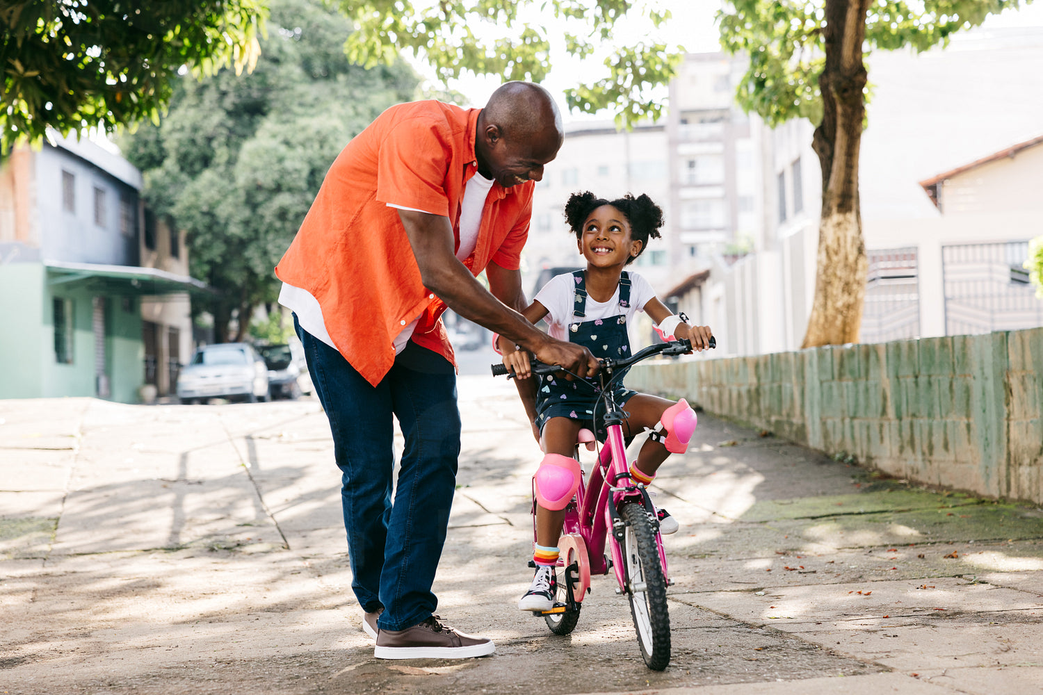 A smiling black father helps his joyful daughter ride her pink bicycle outdoors on a sunny street. A parent teaching his child how to ride a bike.