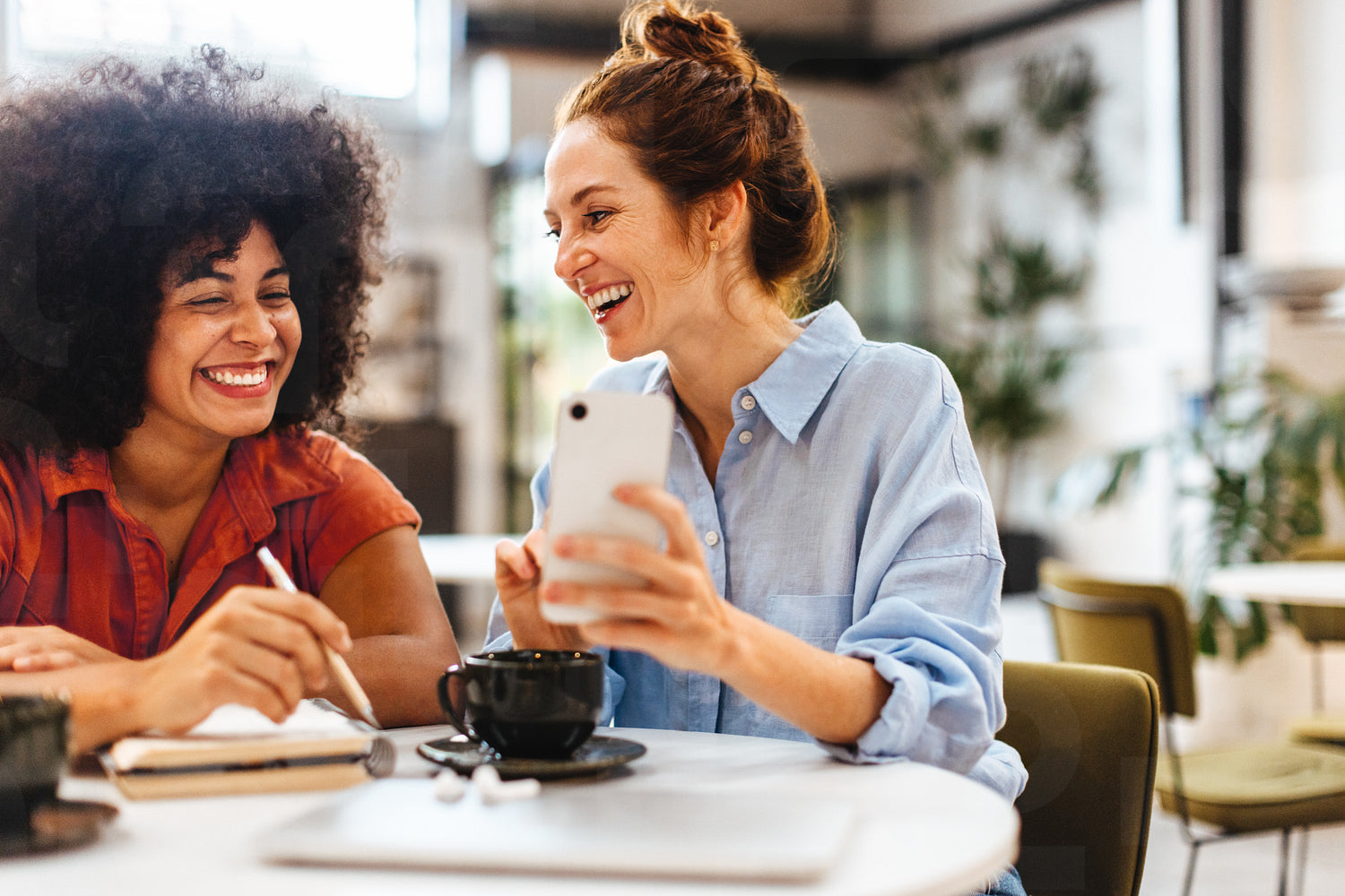 Two female colleagues enjoying a coffee break in their coworking space, reading a client’s text message on a smartphone. Diverse business women smiling as they work together.
