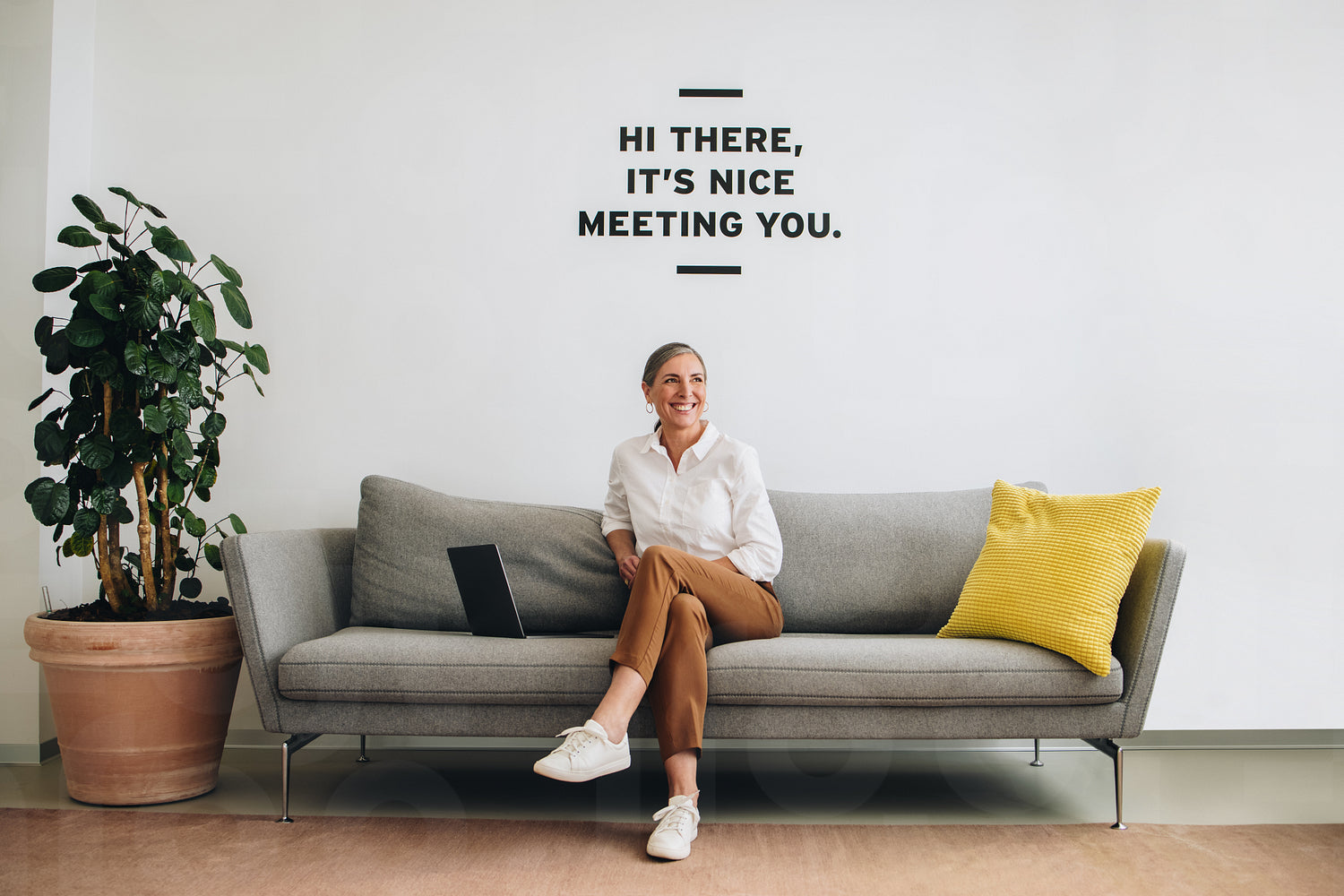 Mature woman sitting on sofa at office lobby. Senior freelance worker looking away and smiling.