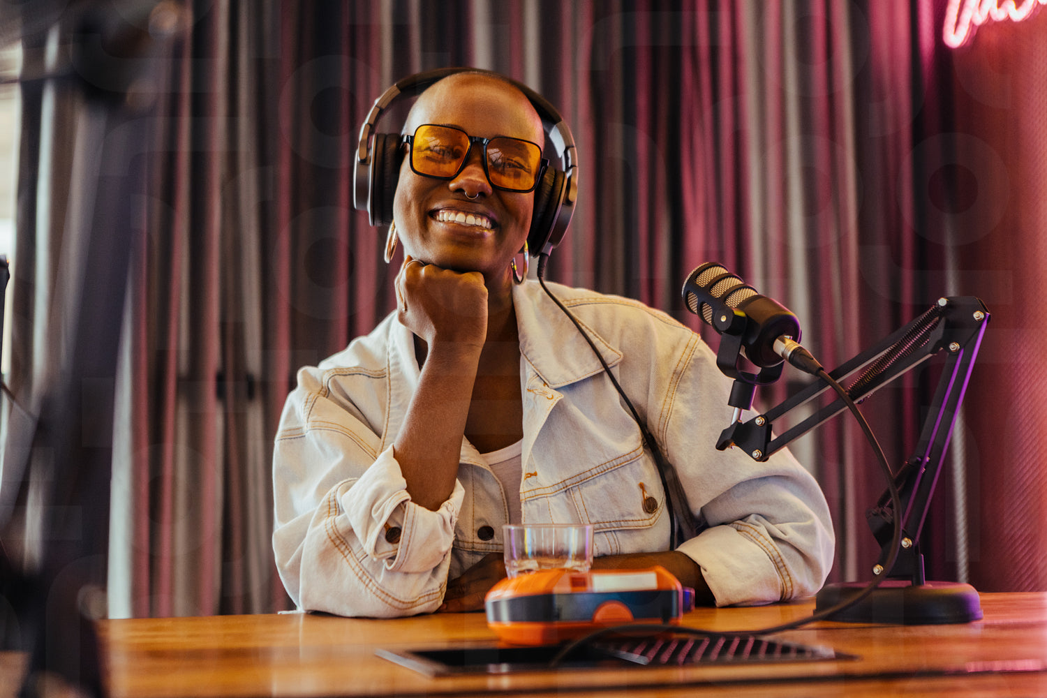 Happy female podcast host enjoying a recording session in a stylish studio environment