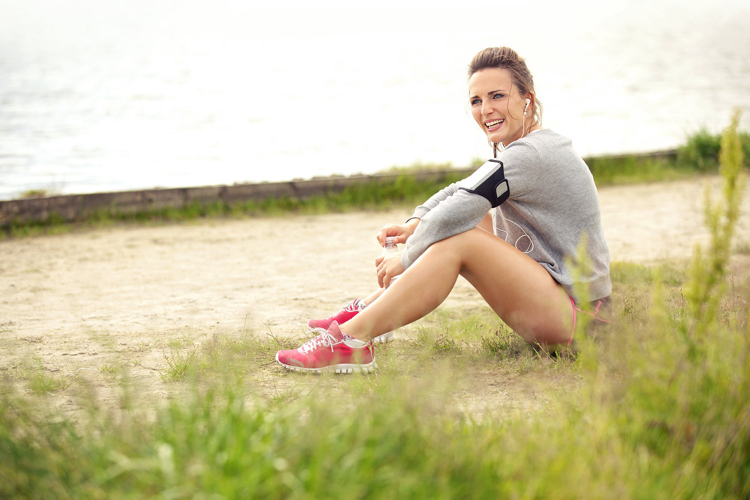 Young female runner looking happy while resting at a lake
