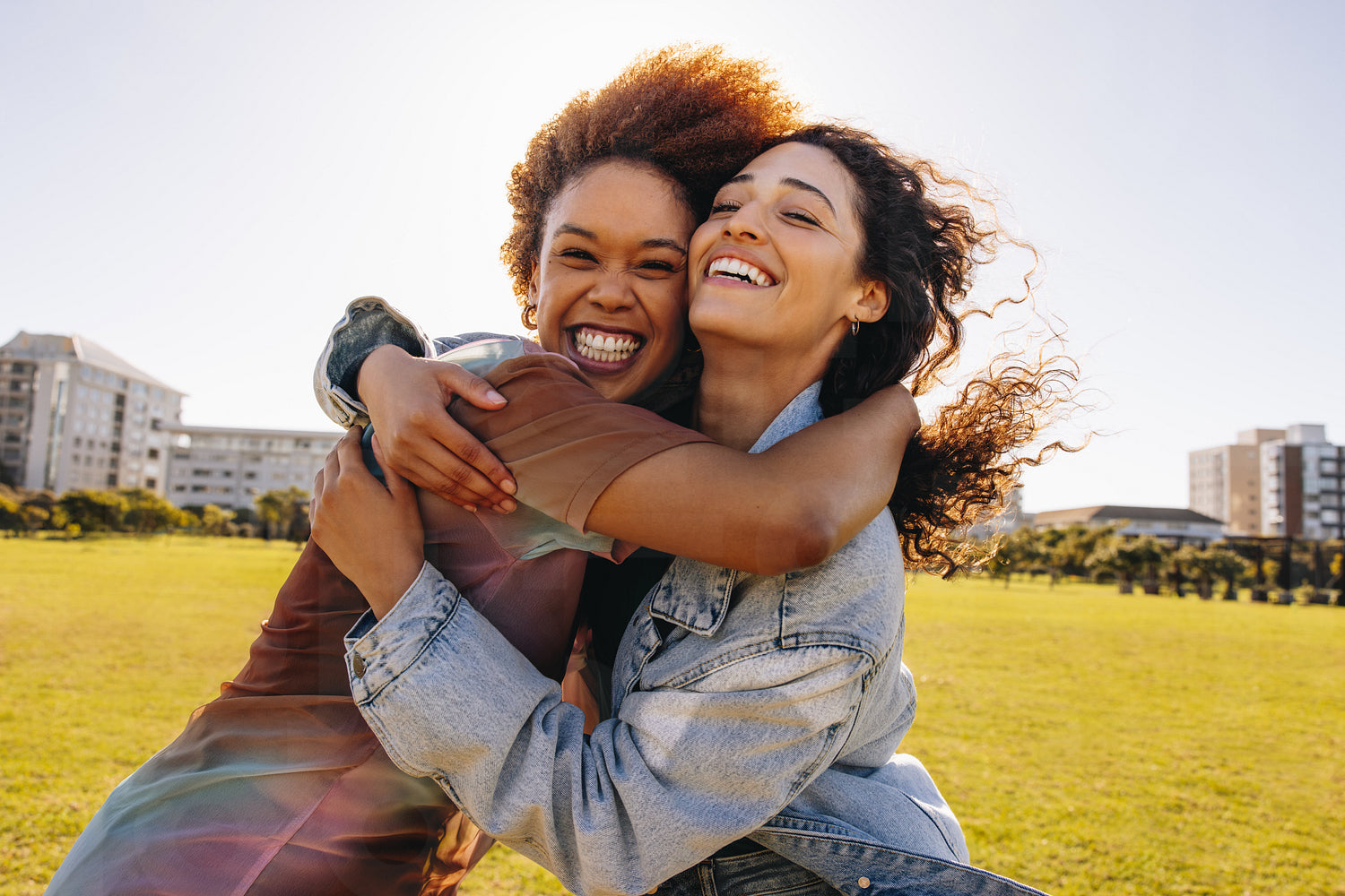 Two cheerful female students hugging in public park on a sunny afternoon, reflecting joy, friendship, and happiness.
