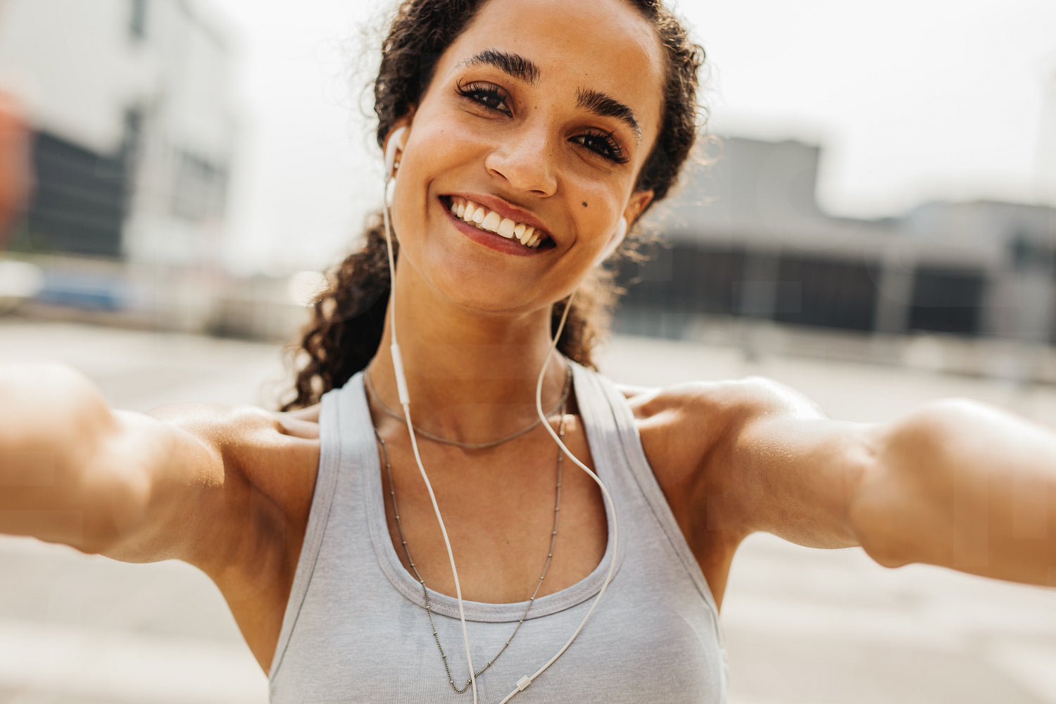 Happy fitness woman taking selfie outdoors in morning. Female athlete wearing earphone looking at camera and smiling.