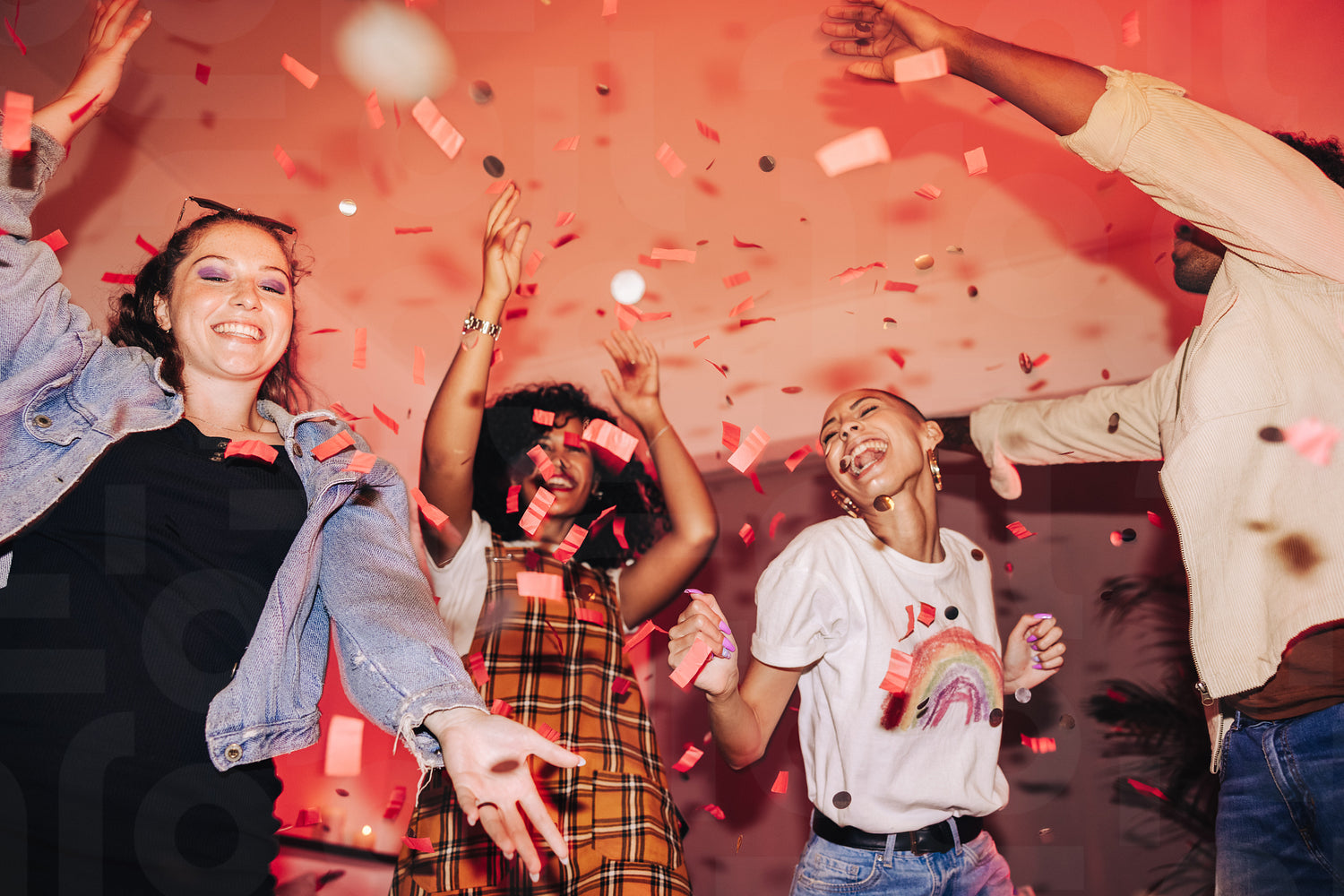 Happy friends dancing to their favourite song under falling confetti. Group of cheerful young people having fun at a house party. Multicultural friends enjoying their weekend together.