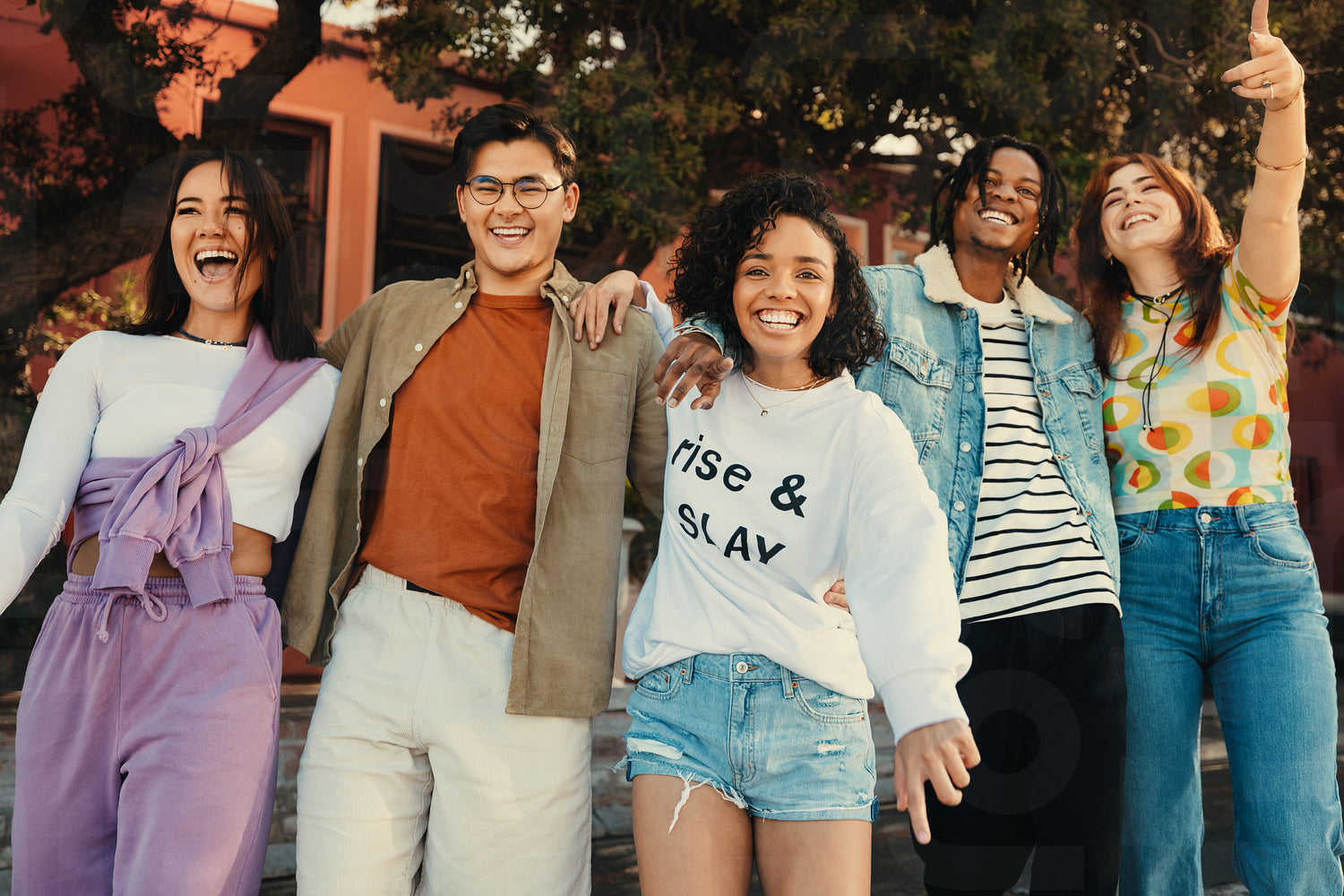 Group of happy friends spending quality time abroad, smiling and celebrating their friendship.