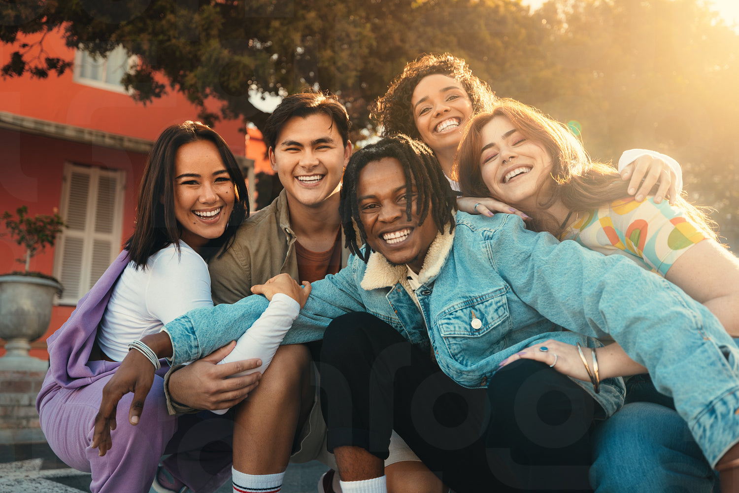Group of happy friends smiling and bonding while participating in a study abroad program outdoors.
