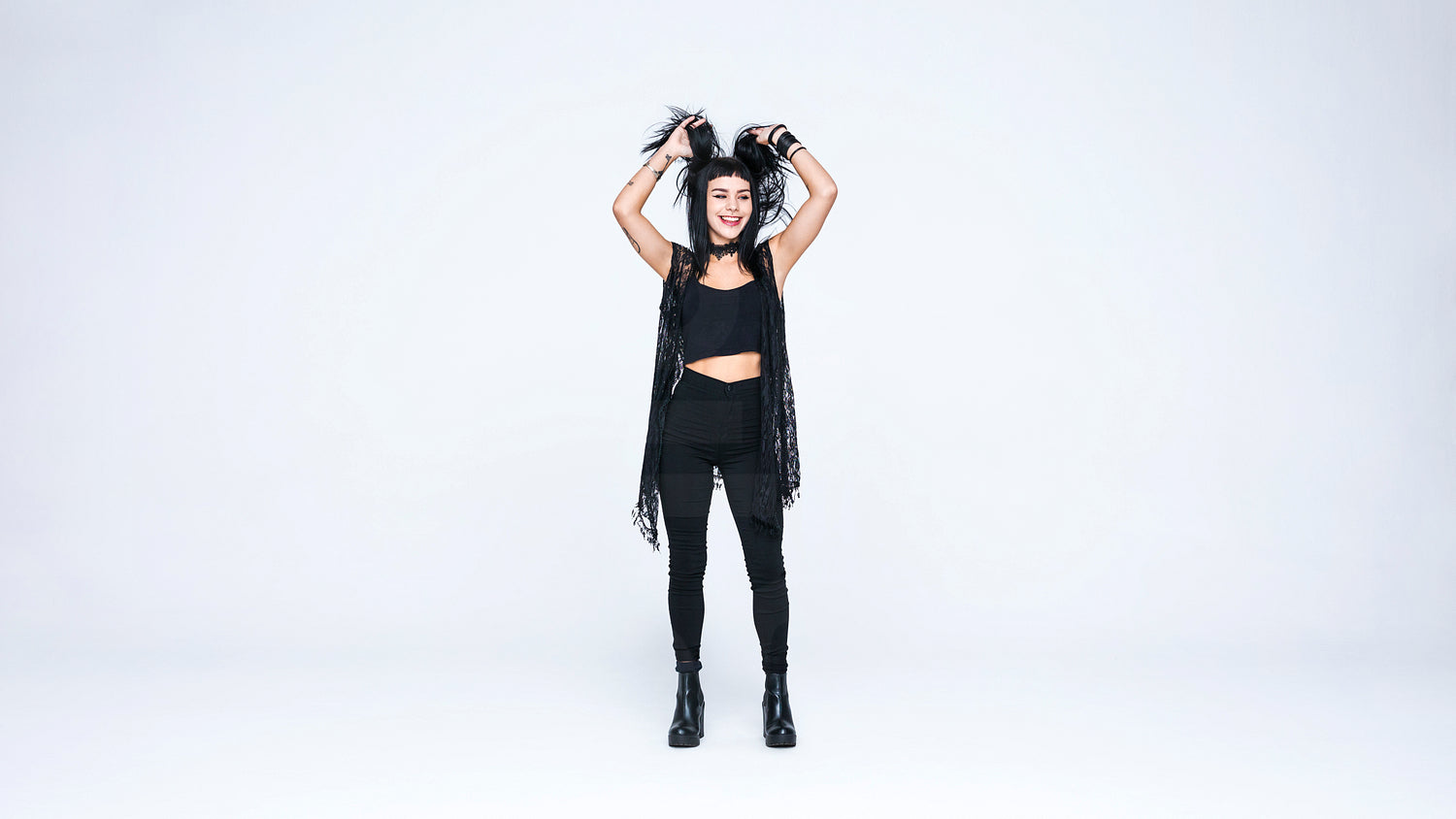 Young gothic woman playing with her hair standing isolated on white background. Smiling gothic woman with fashion piercing on lips standing.