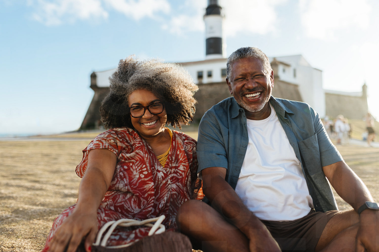 Joyful grandparents posing near a historic lighthouse in Salvador, embracing the warmth of a sunny coastal vacation. Perfect for concepts of family, relaxation, and travel.