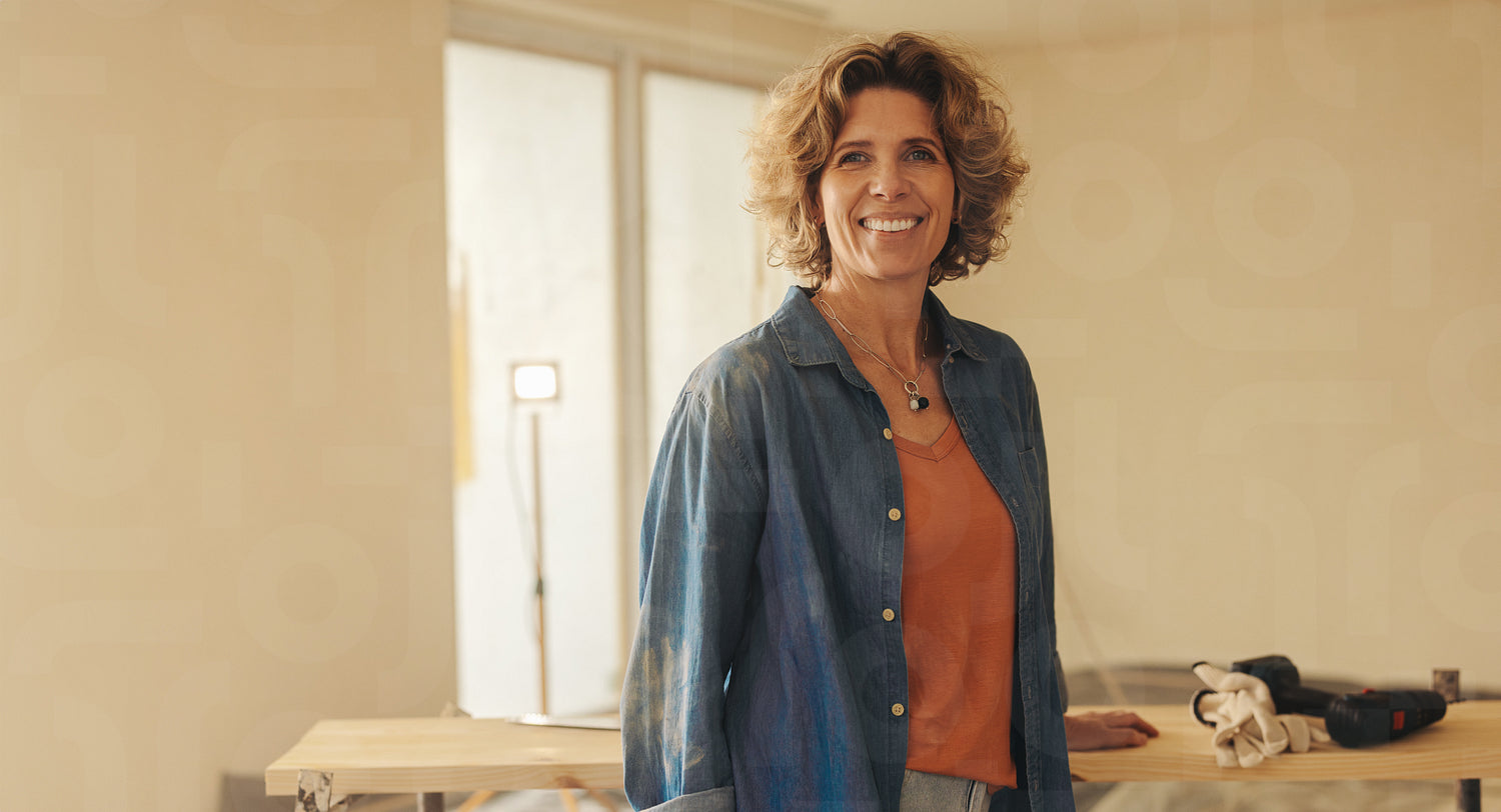 Portrait of a happy woman standing in her house, smiling at the camera as she engages in carpentry work. Mature woman renovating her home to create a welcoming and modern space.