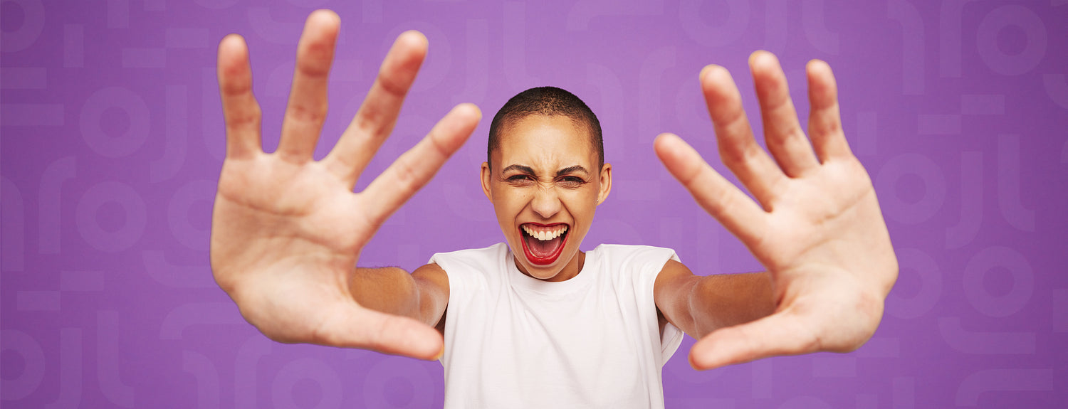 Wide angle portrait of a happy looking woman on purple background. Female model with shaved head and hands in front.