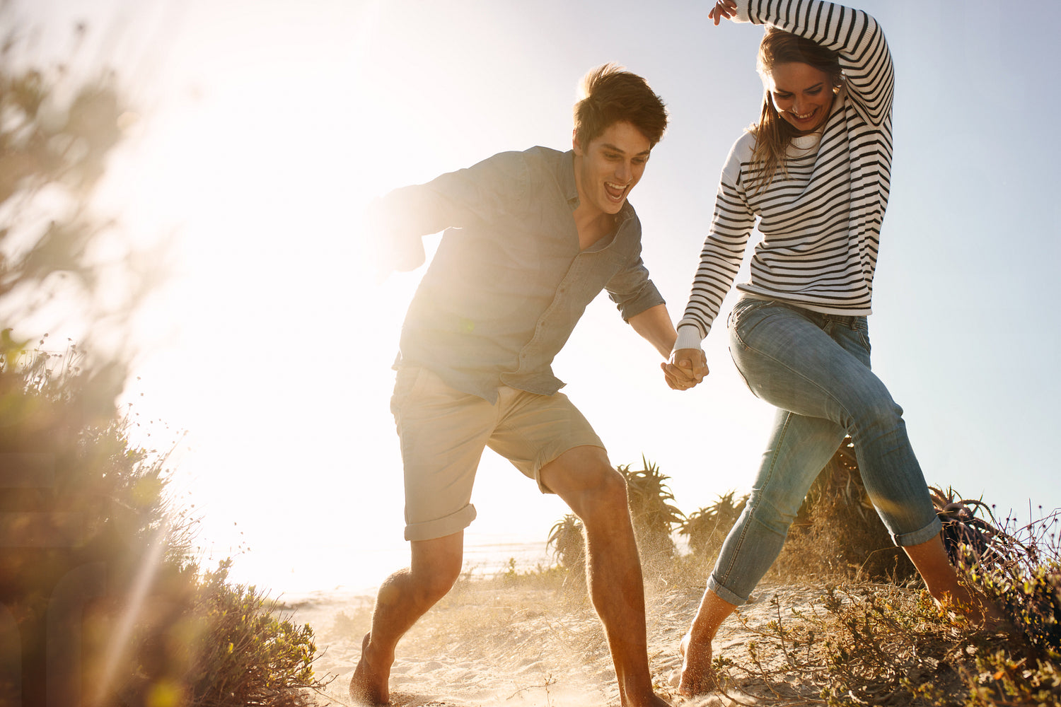 Couple playing and running in the sand near sea shore on a sunny day. Happy couple enjoying and having fun on the beach holding hand with sun flare in the background.