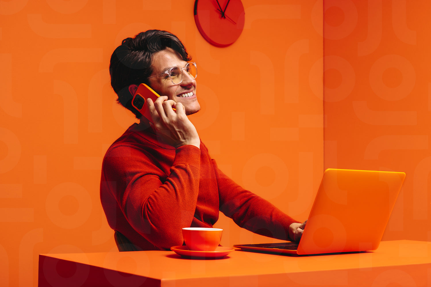 Happy man talking on the phone in a vibrant, monochromatic orange office environment with a laptop and cup, highlighting a cheerful and modern workspace.