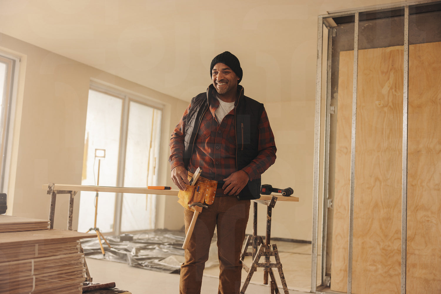 Happy mature man with a tool belt stands in his kitchen, using his DIY skills to renovate the interior. He looks away at the pile of tiles, ready to start the flooring for improvement and remodelling.