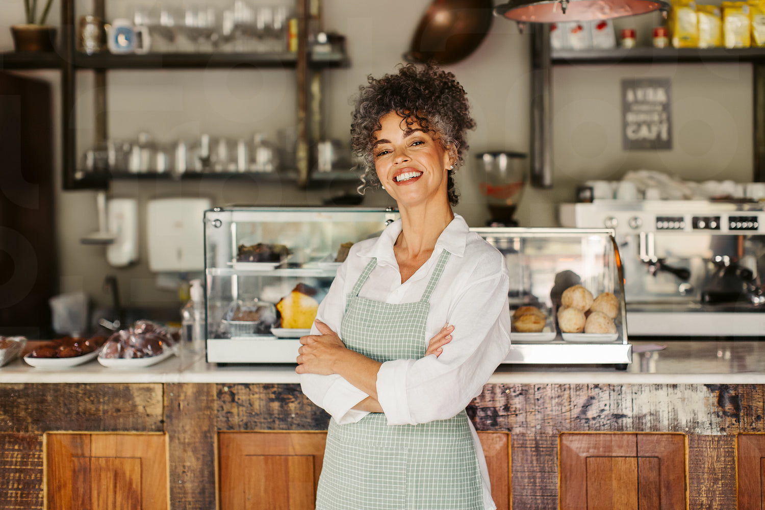 Happy mature business owner smiling at the camera while standing with her arms crossed. Successful businesswoman feeling confident while wearing an apron in front of her coffee shop during the day.