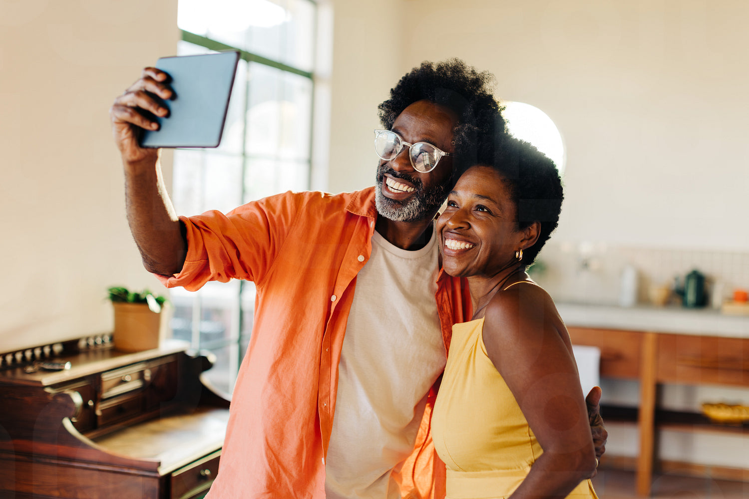 Happy black couple taking a romantic selfie at home using a tablet, capturing their joyful life together. Mature husband and wife cherishing their loving marriage and relationship.