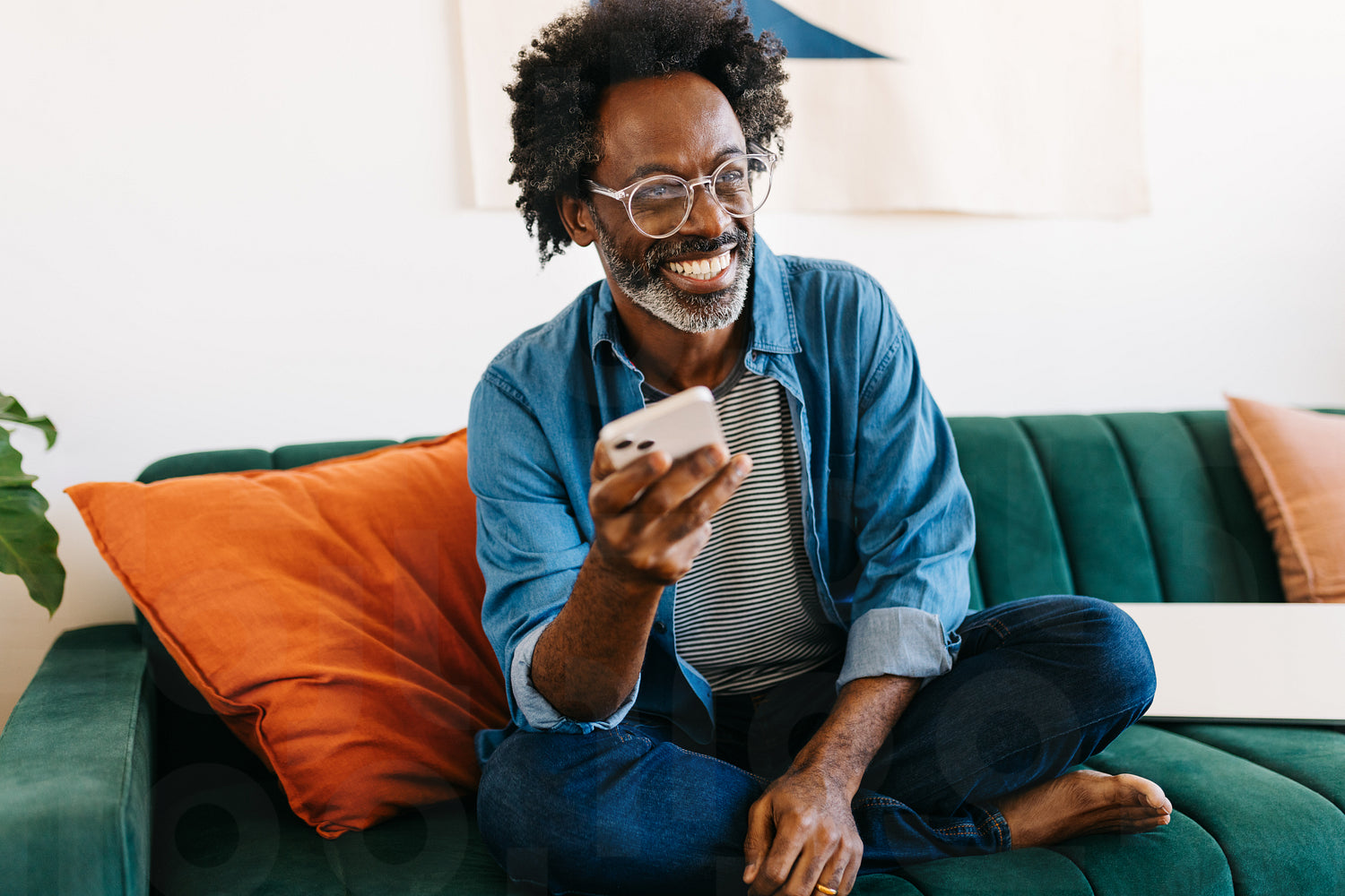 Black man with afro hair sitting on a couch in his living room, holding a smartphone with a happy smile. Mature man relaxing at home in denim clothing, using mobile technology to browse the internet.