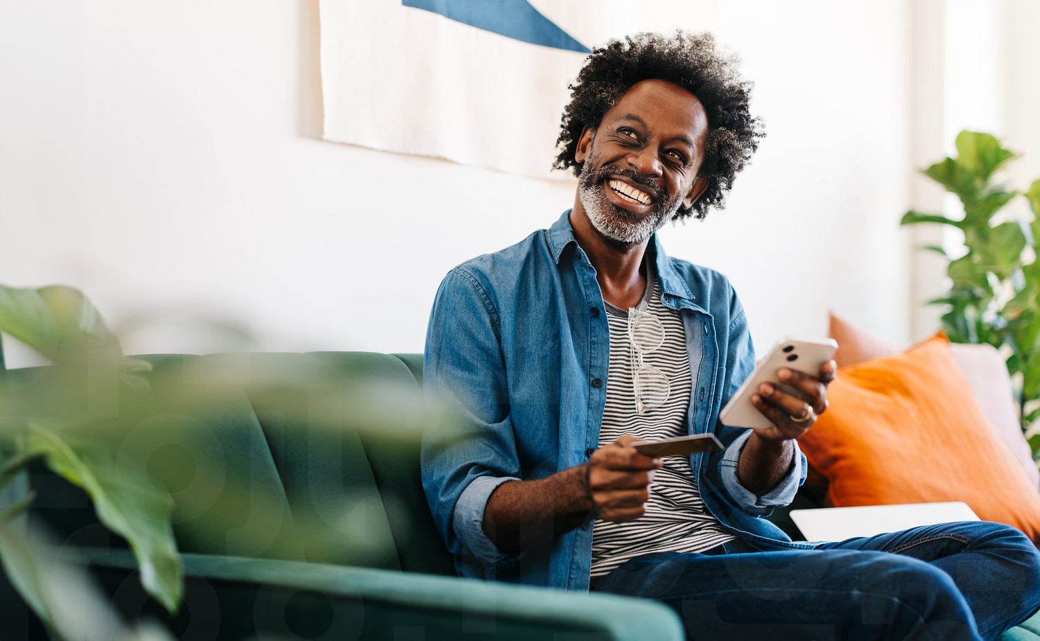 Happy, mature black man uses a mobile phone to make an online payment with a credit card. He is sitting on a sofa in his living room, enjoying the convenience of a banking app for online shopping.
