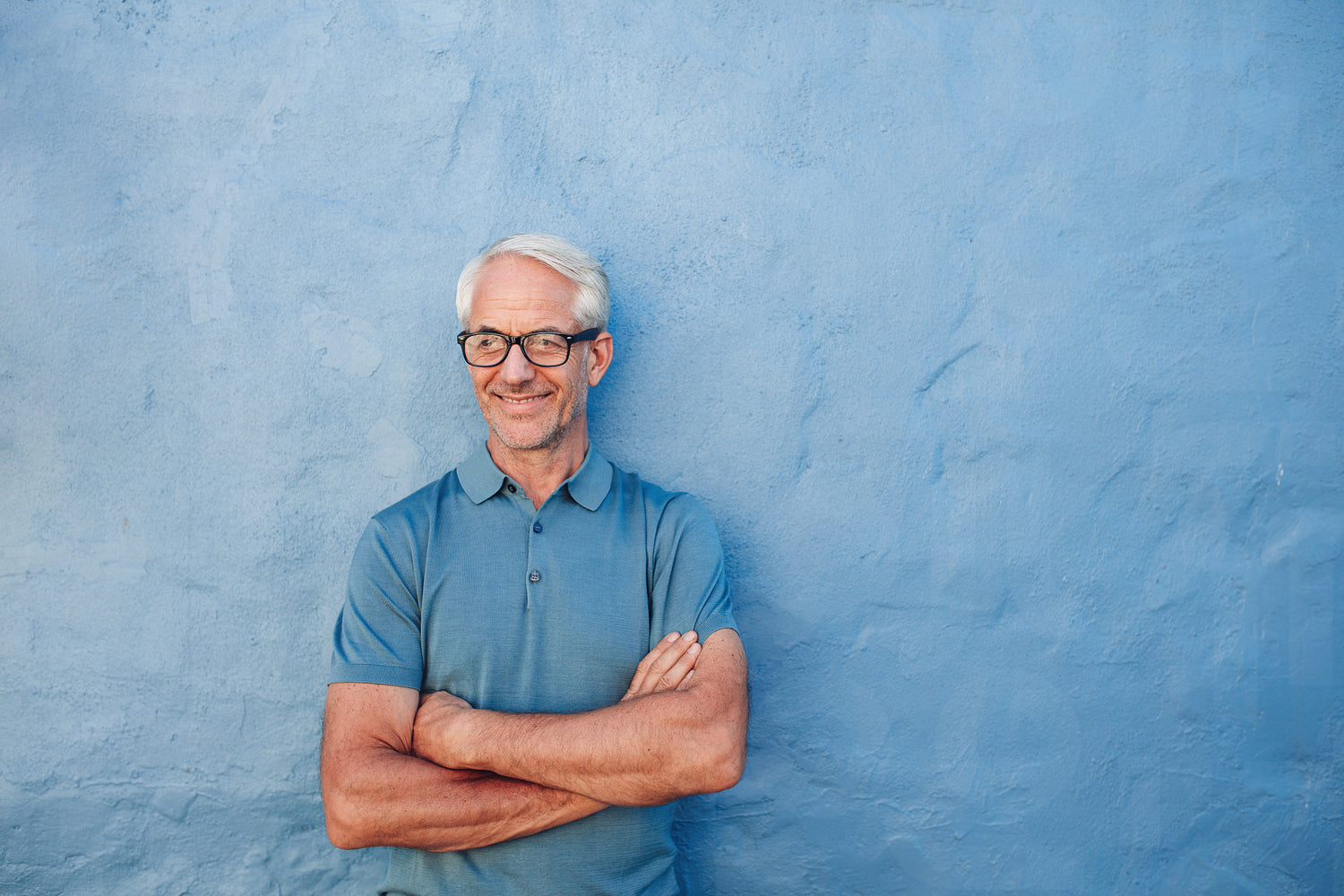 Portrait of a happy mature man standing with his arms crossed against a blue wall. Caucasian male wearing glasses looking away and smiling.