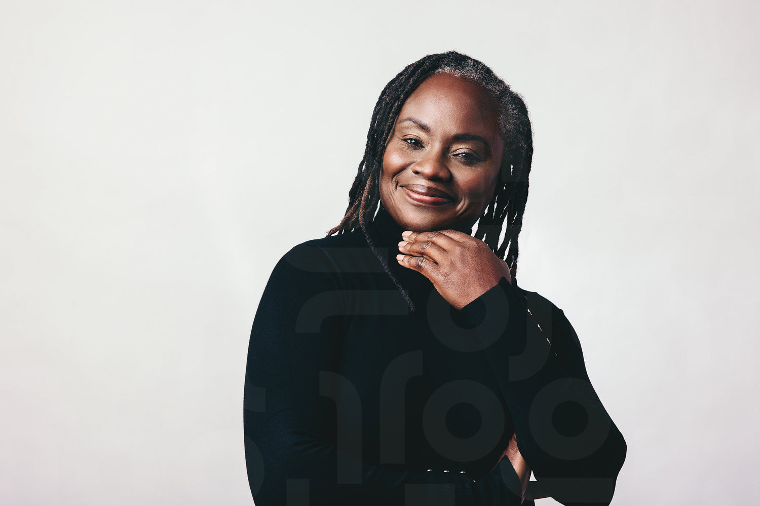 Happy mature woman with dreadlocks looking at the camera with a smile in a studio. Fashionable middle-aged woman standing against a grey background.