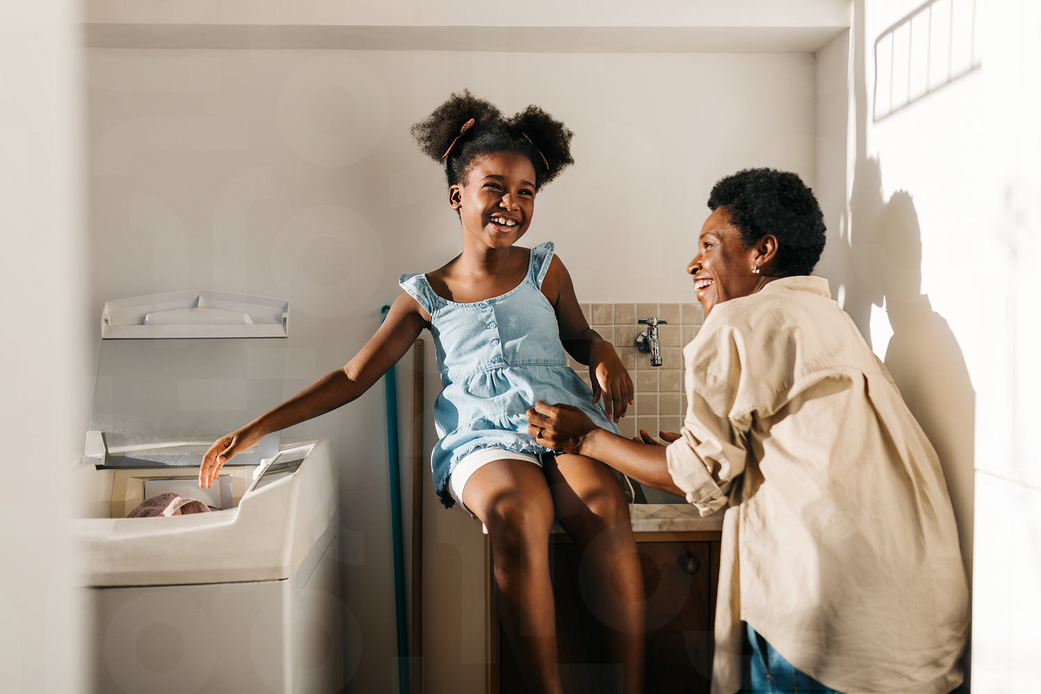Joyful moment in the laundry room as a mother and her young daughter, both smiling, load clothes into the washing machine together. Black family happily doing their household chores at home.
