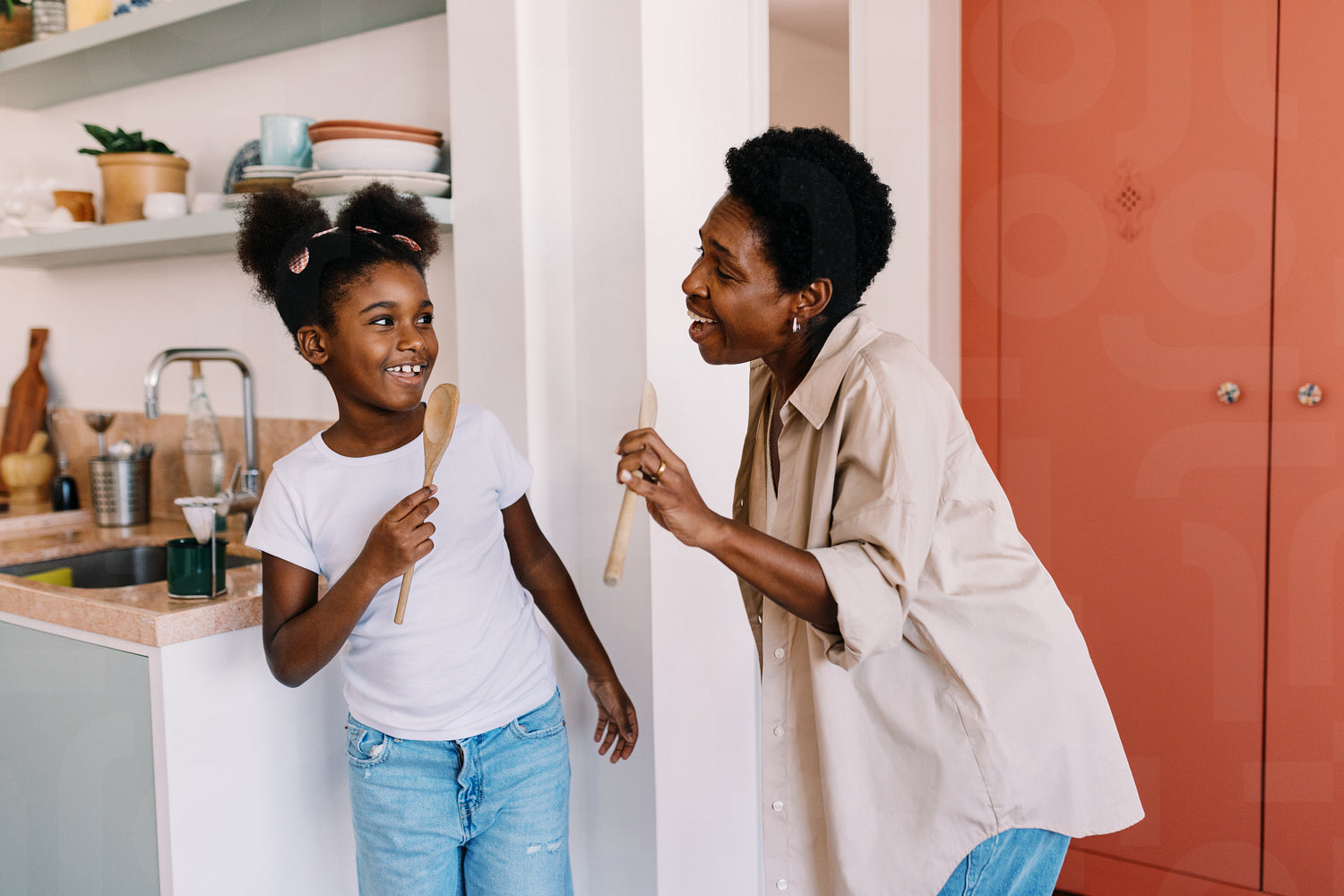 Afro-haired mom and daughter happily sing and dance in the kitchen, using wooden spoons as microphones. Mother and daughter bonding through their love for music at home
