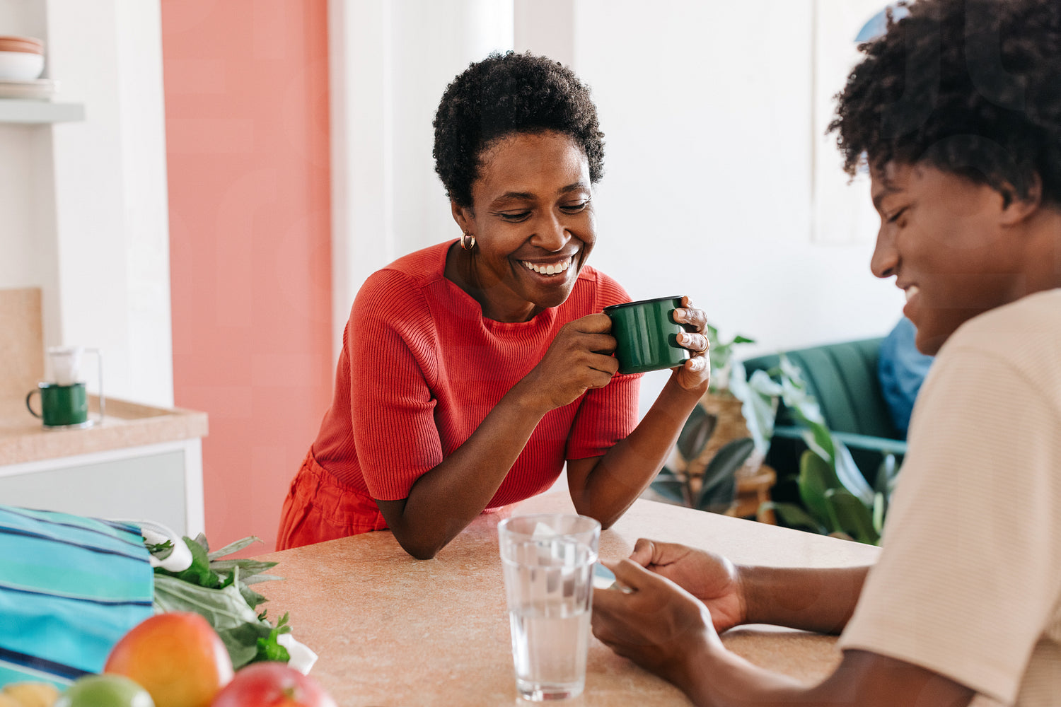 Black Brazilian family at home in the kitchen, enjoying a relaxed morning together. Happy mother having coffee while her son uses a smartphone, creating a joyful family moment.
