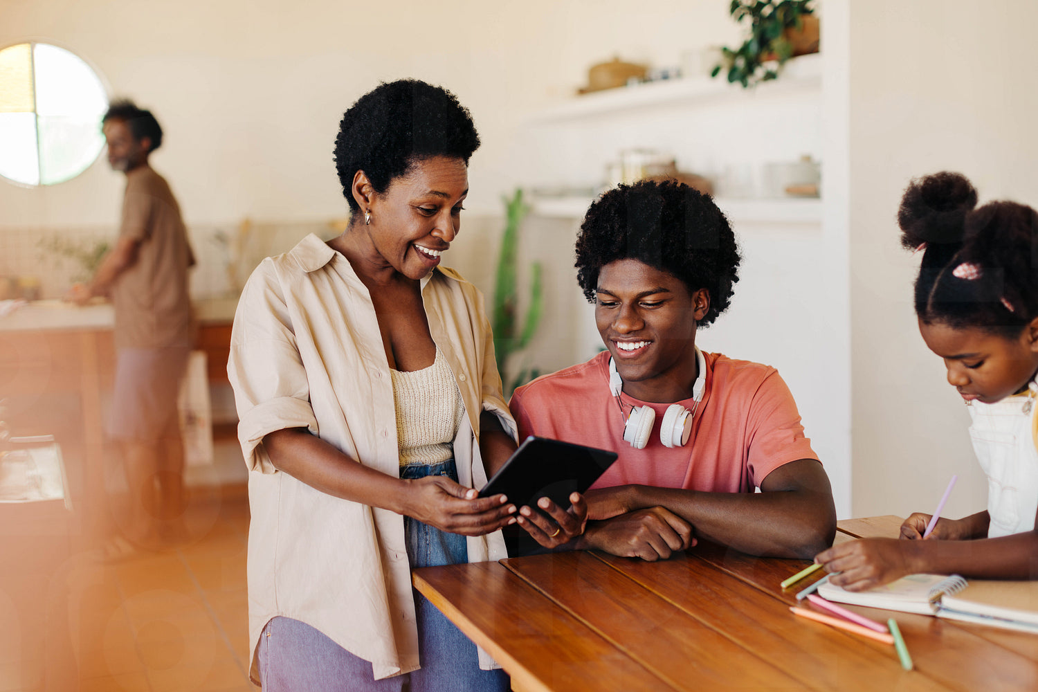 Brazilian family enjoys elearning together in their kitchen. The mother assists her son with homework using a tablet device. The daughter observes happily. Education and technology unite this happy black family.